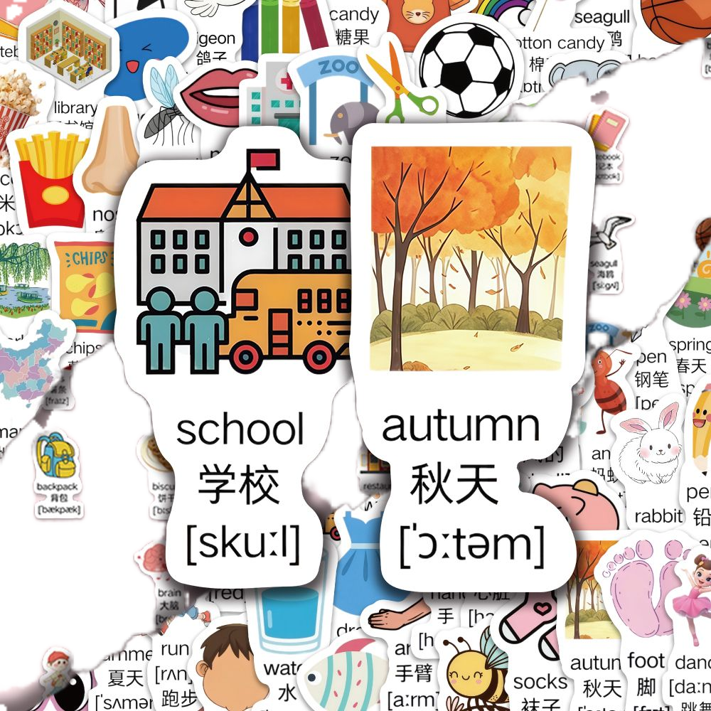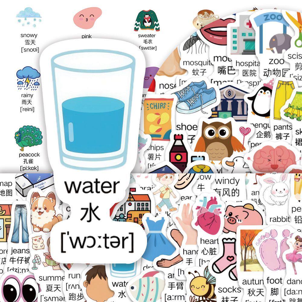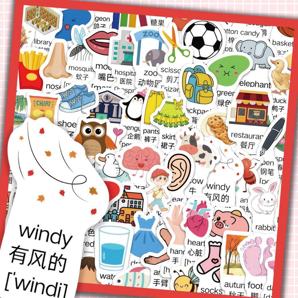 300张幼儿启蒙英语单词贴纸创意儿童趣味学习早教贴画卡通diy