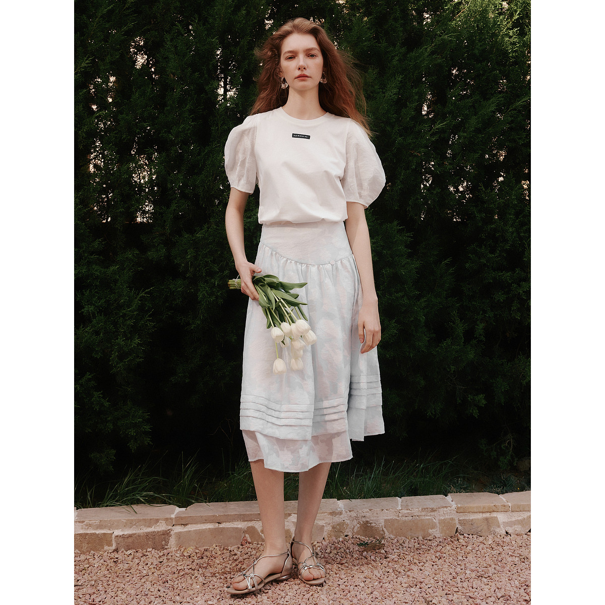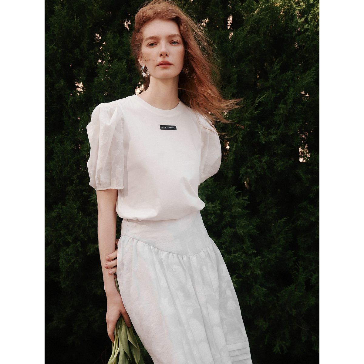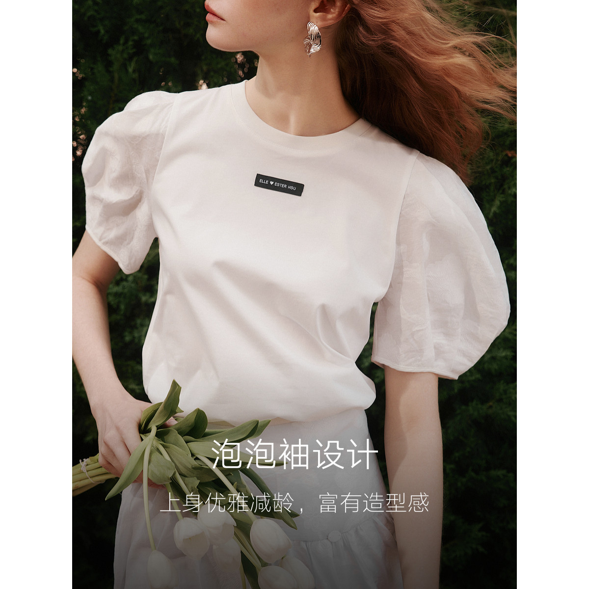 【ESTER HSU】ELLE白色泡泡袖短袖女2025夏季新款提花休闲T恤上衣