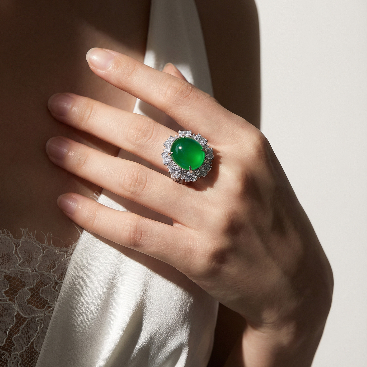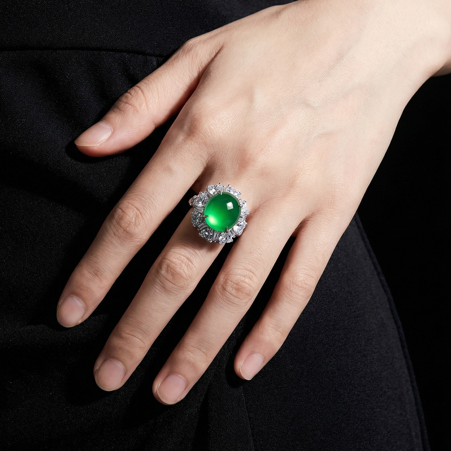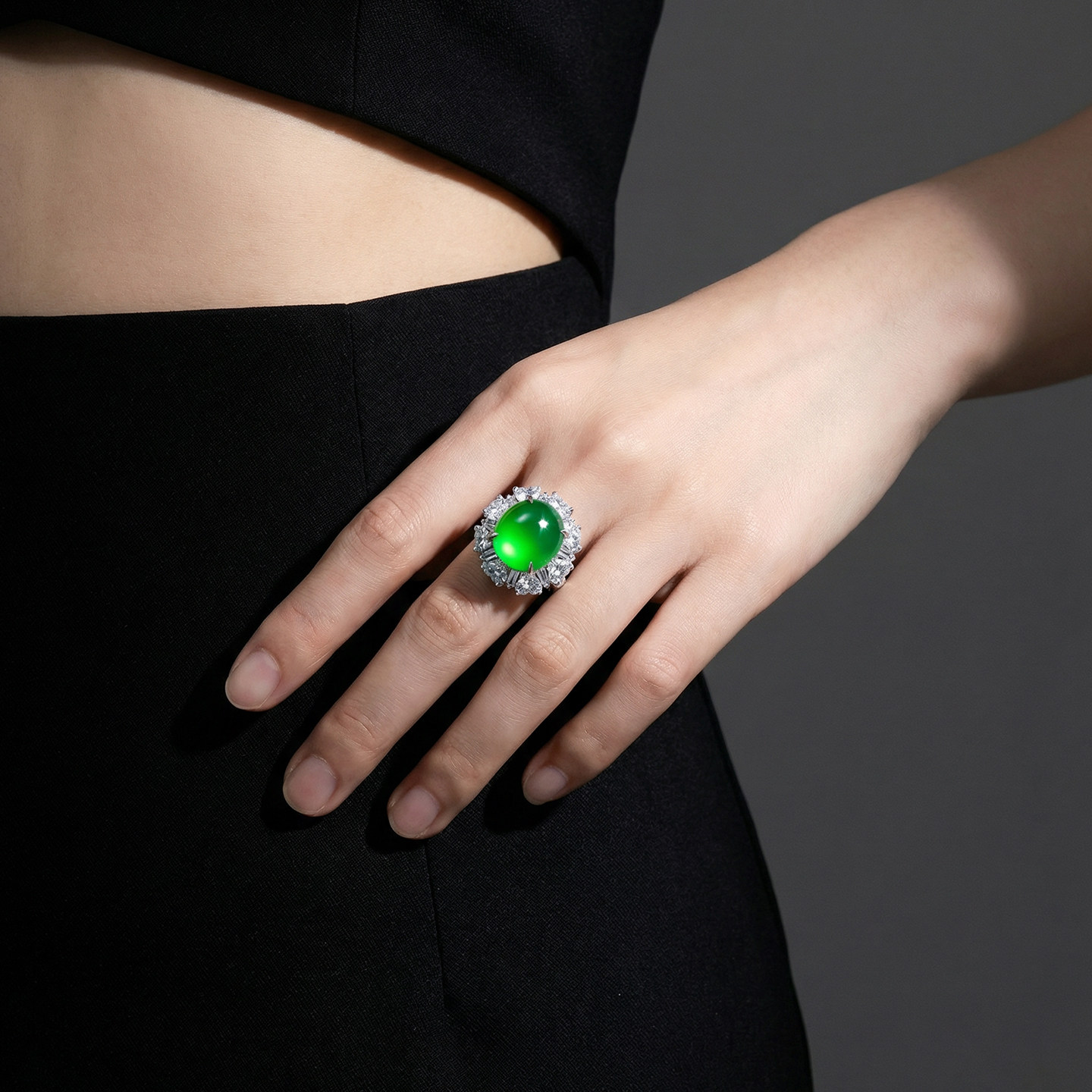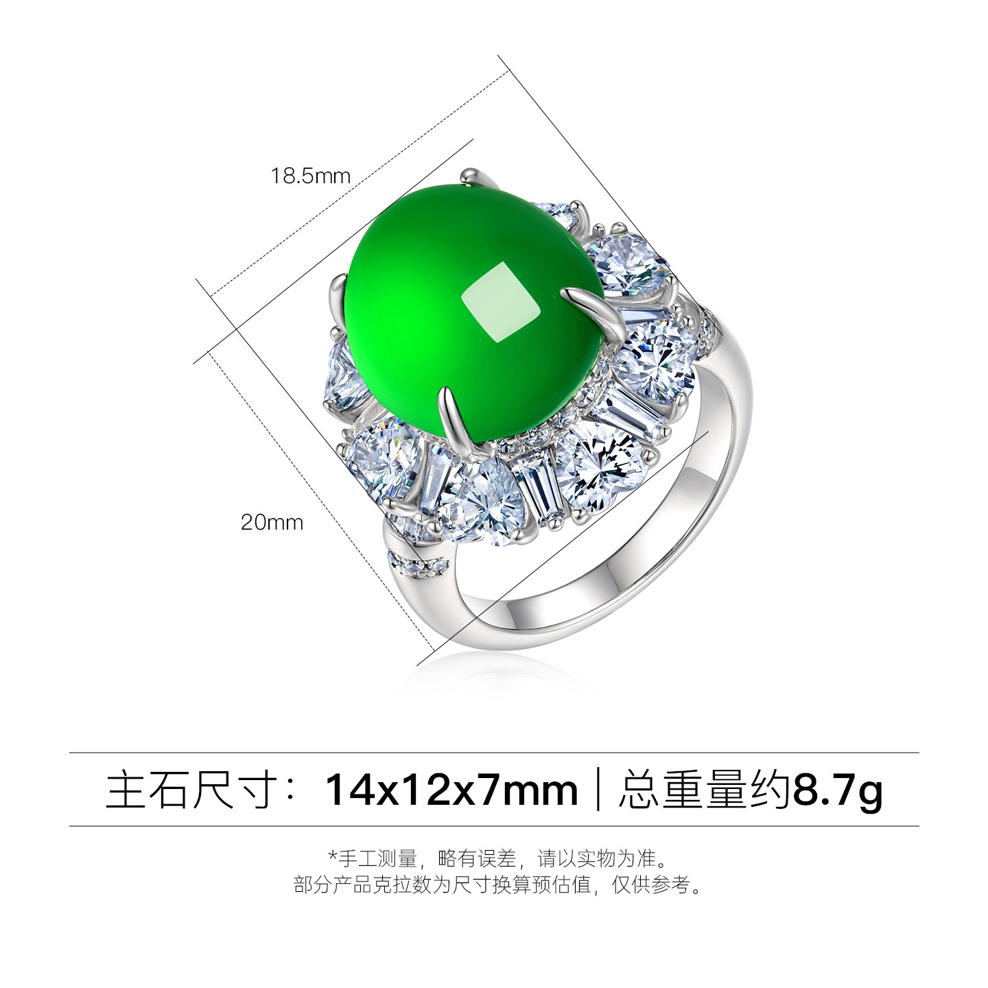 AILEQ925银天然玉髓满绿桃心蛋面欧若风戒指时尚珠宝明星同款饰品