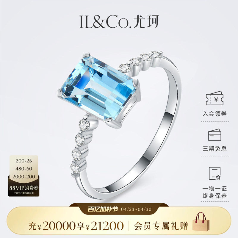 ILCO尤珂「冰蓝方糖」18K金天然海蓝宝石戒指时尚方形彩宝女款戒