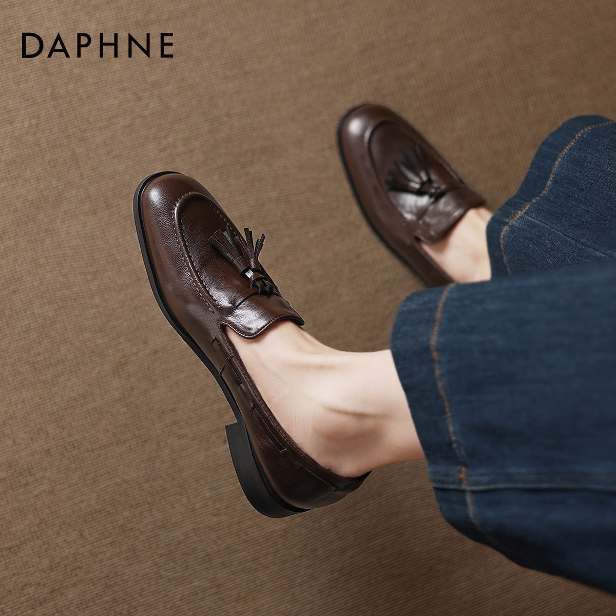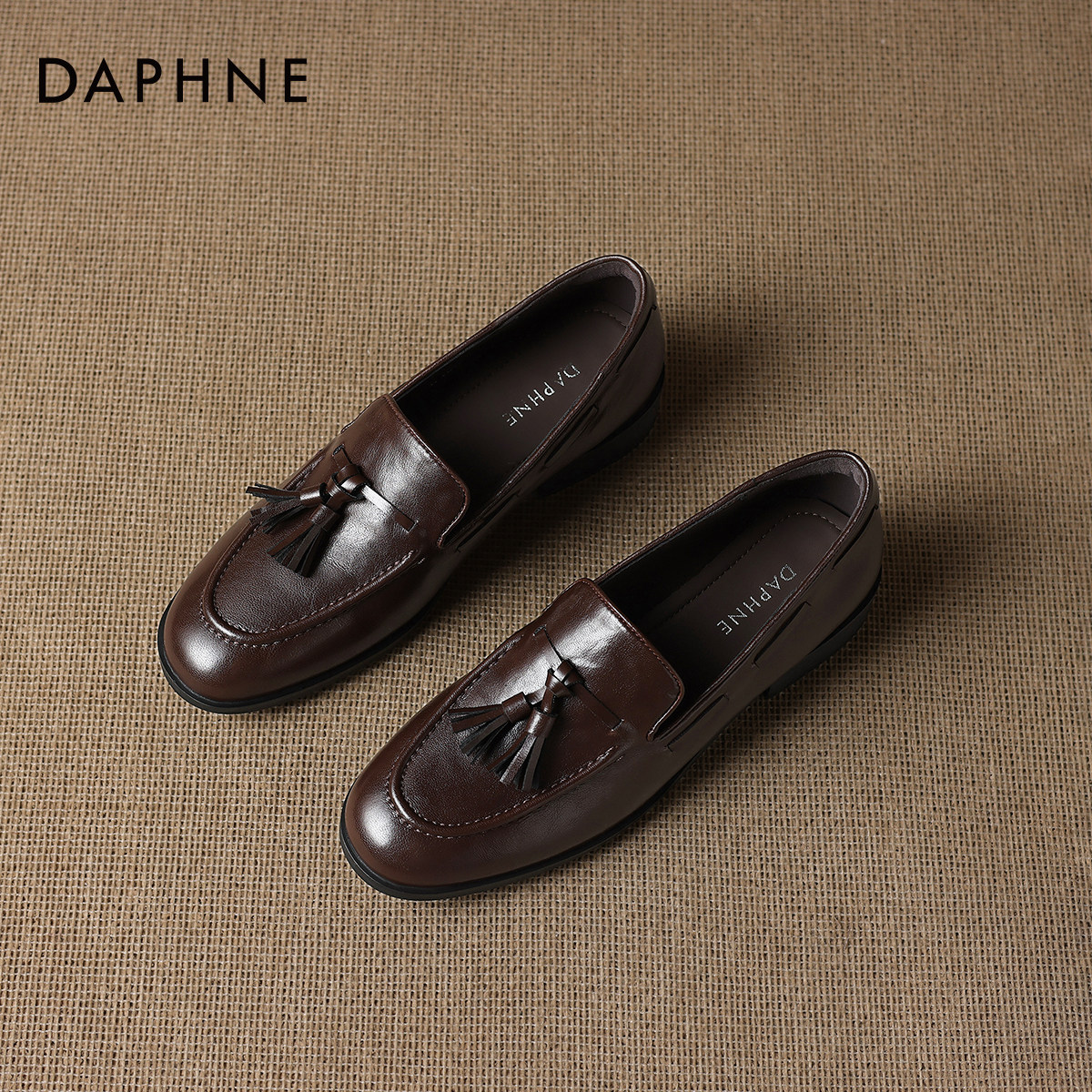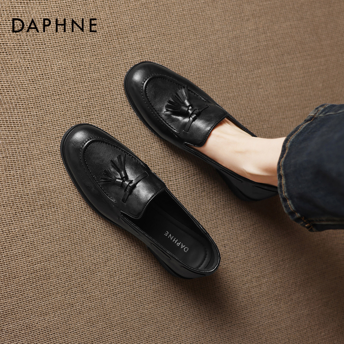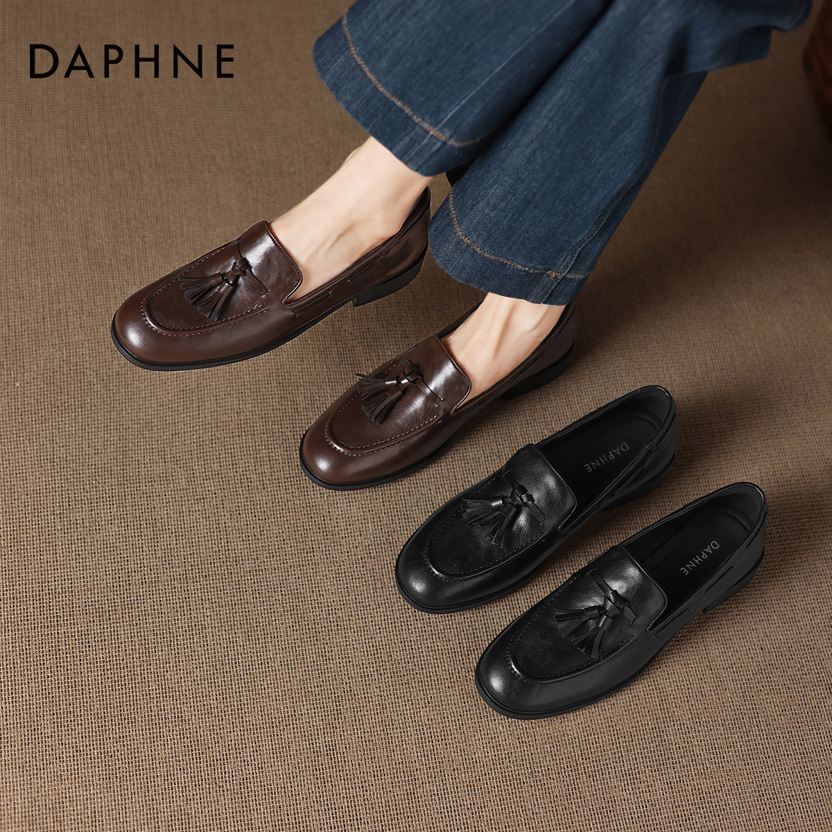 达芙妮乐福鞋女2026春季新款一脚蹬浅口单鞋黑色百搭小皮鞋豆豆鞋