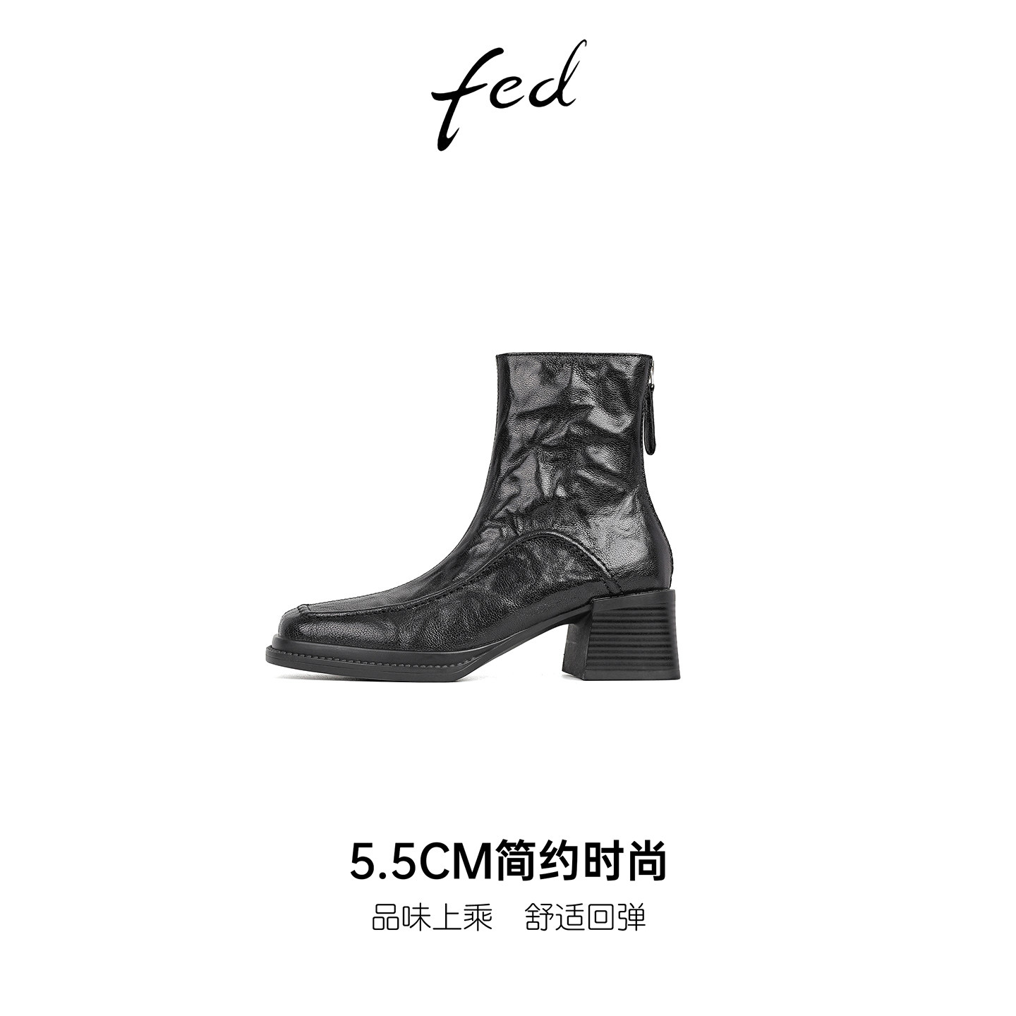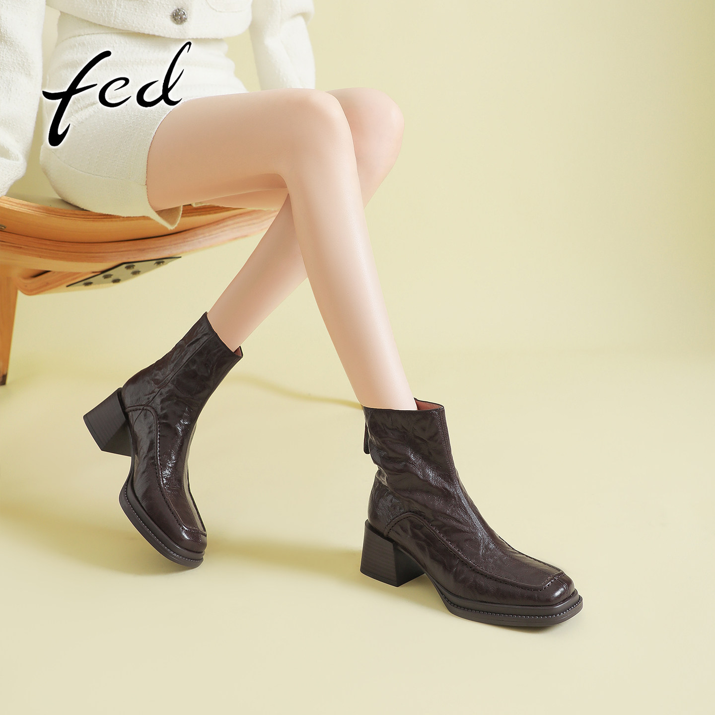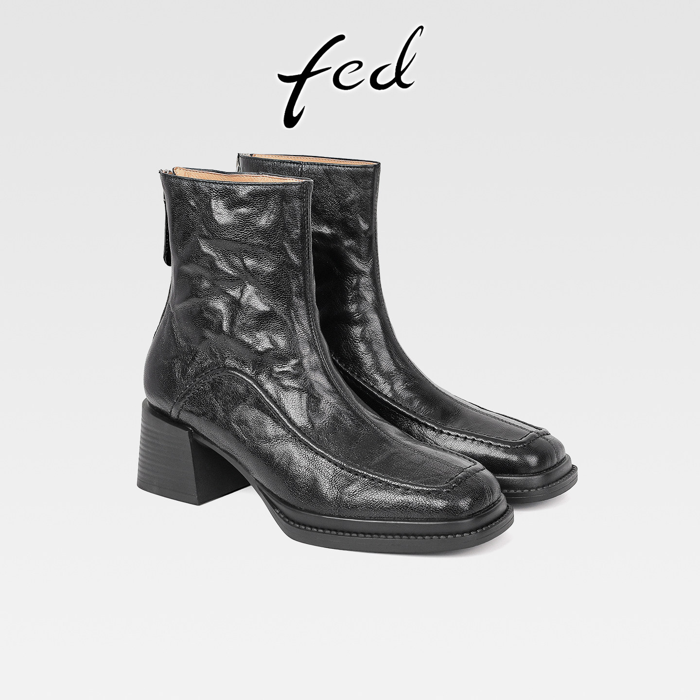 fed复古羊皮粗跟静音底瘦瘦靴女秋冬新款后拉链气质方头高跟短靴