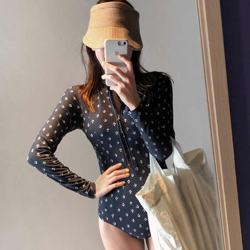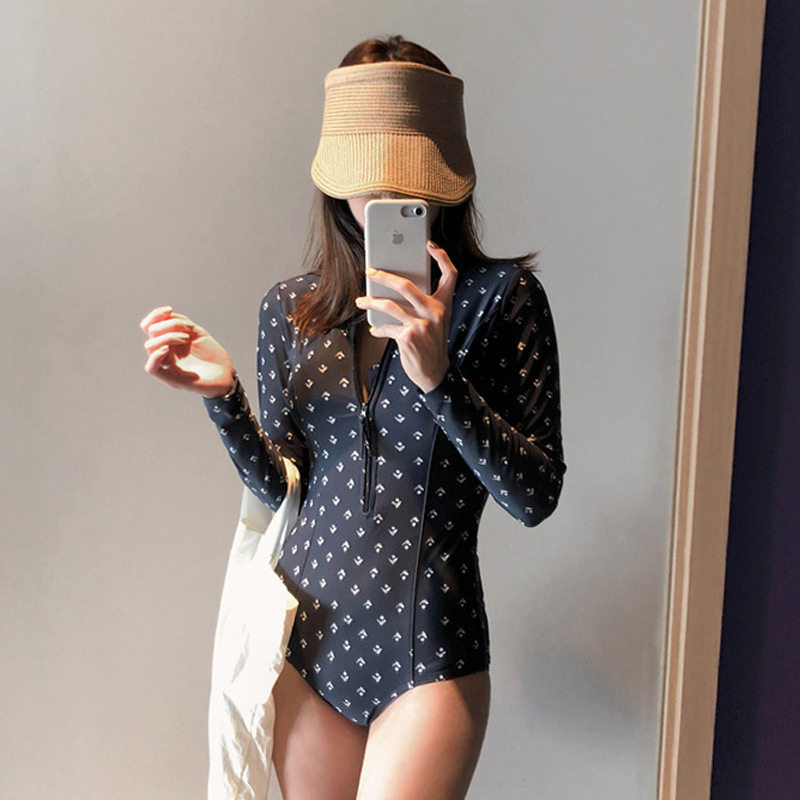 韩国款ins泳衣女2022连体小胸长袖遮肚显瘦浮潜温泉保守游泳衣
