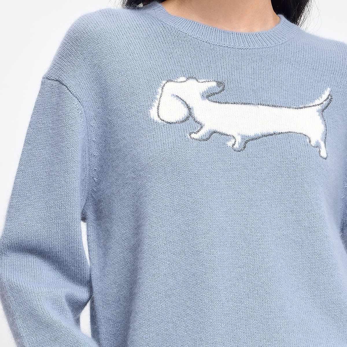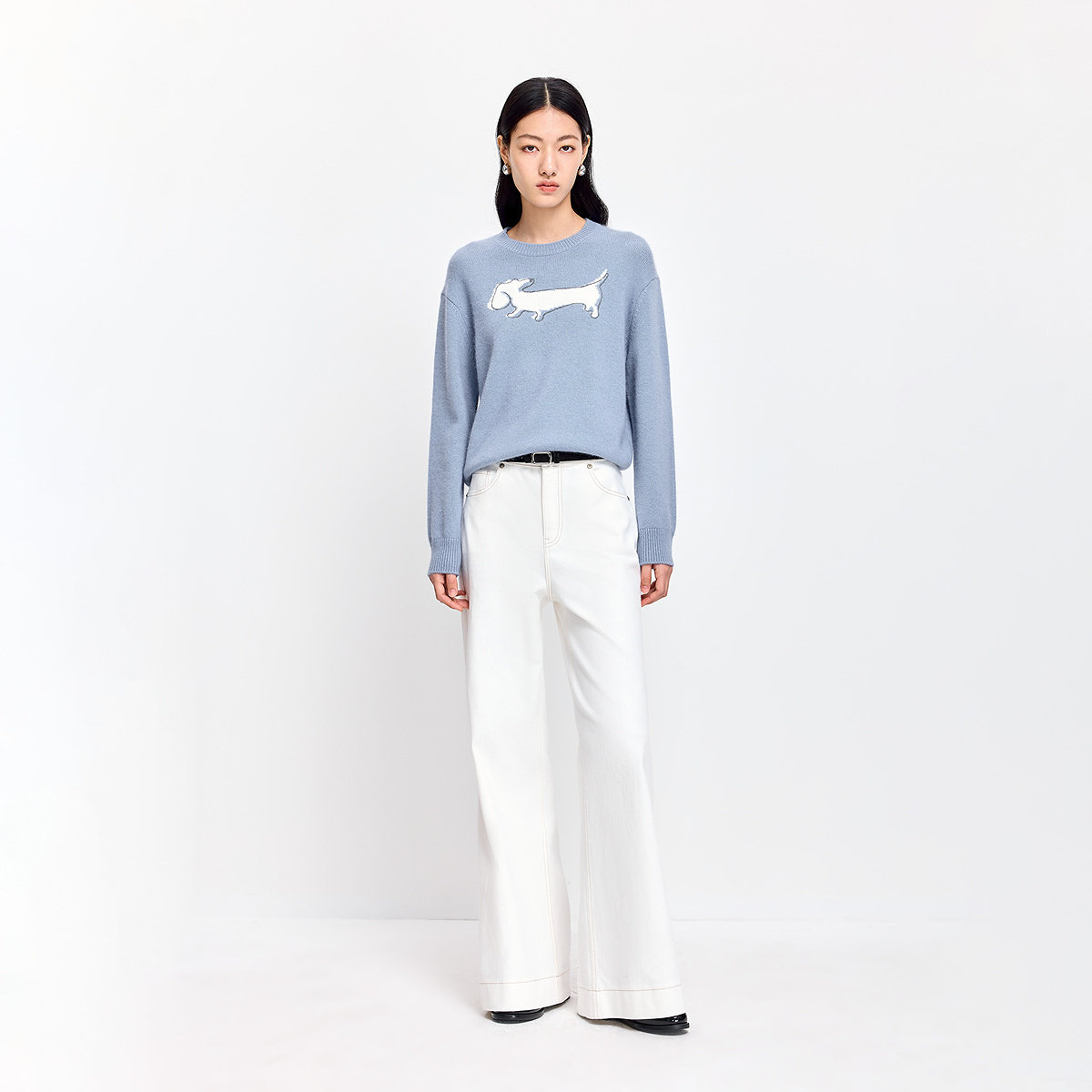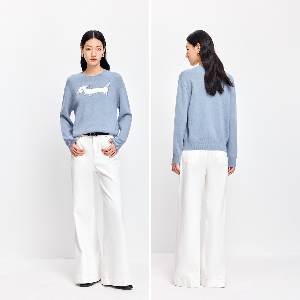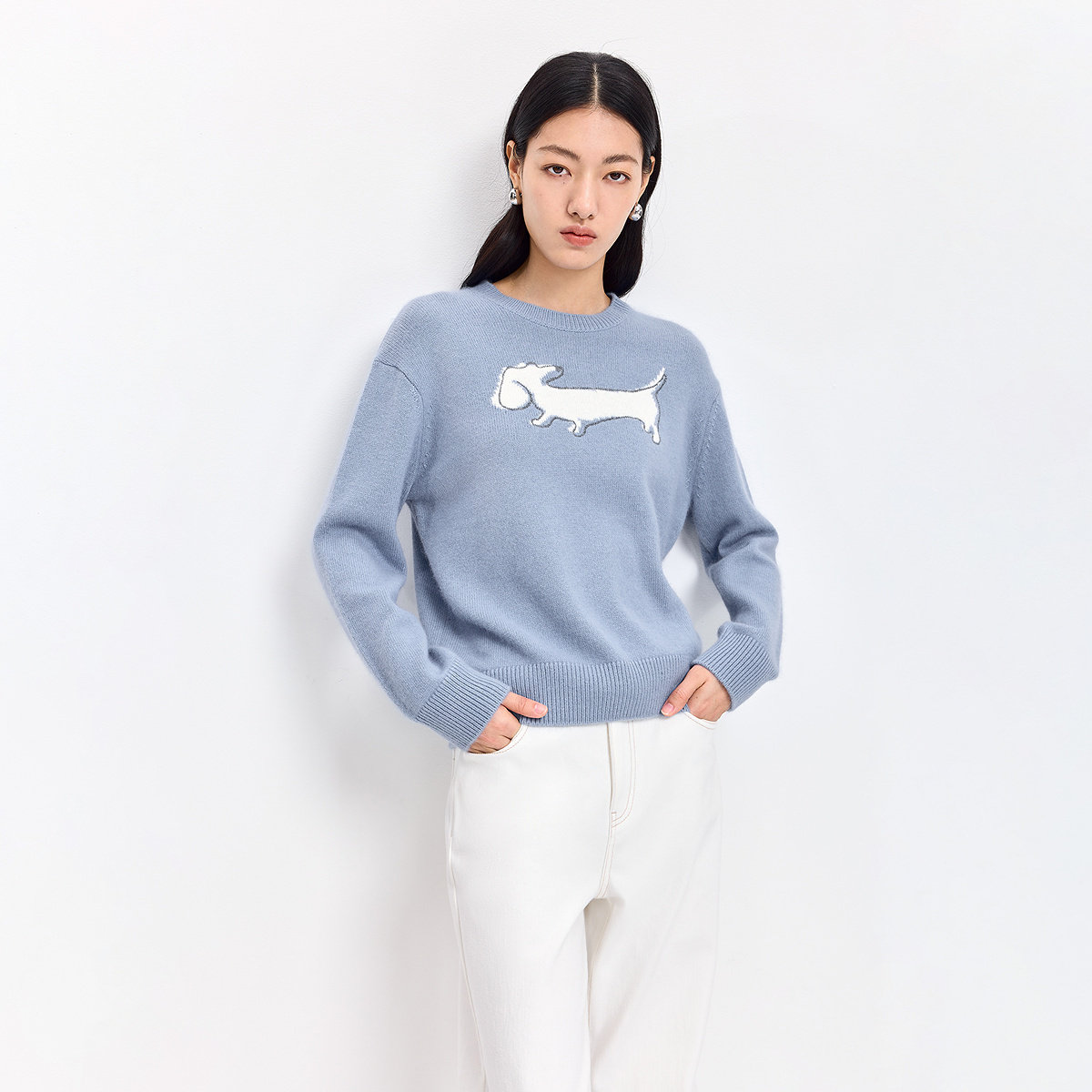 LILY2026春新款含兔毛羊毛撞色小狗图案蓝色套头圆领针织衫毛衣女