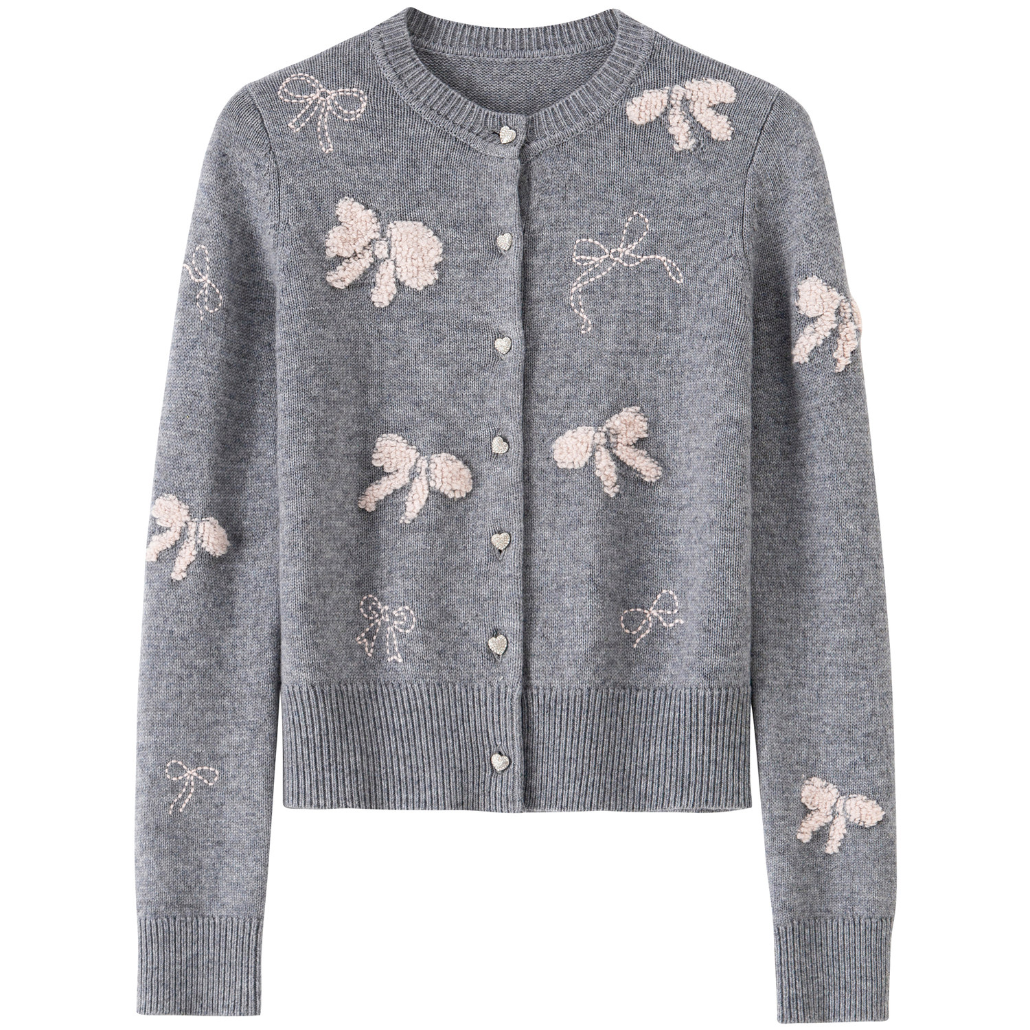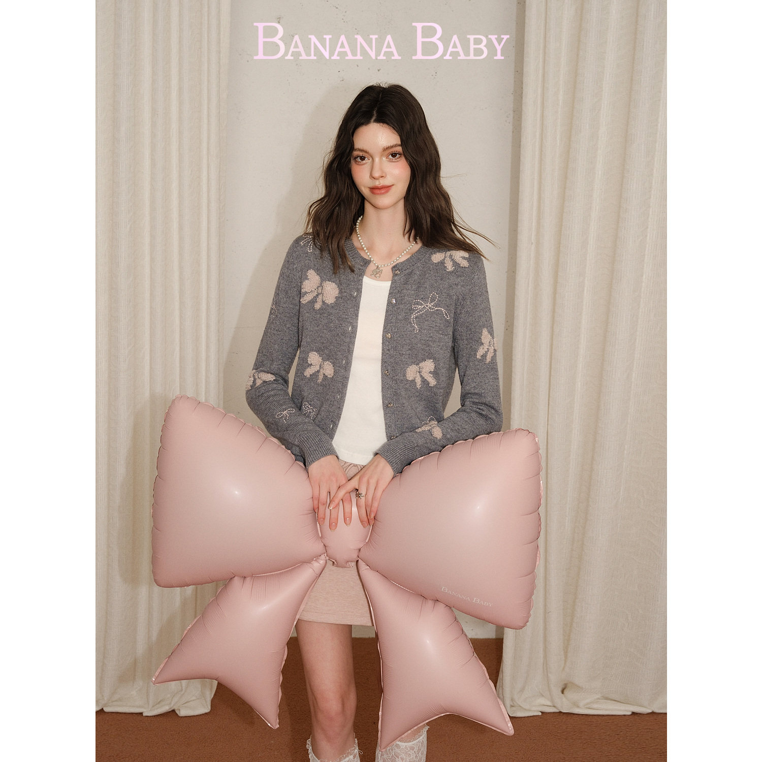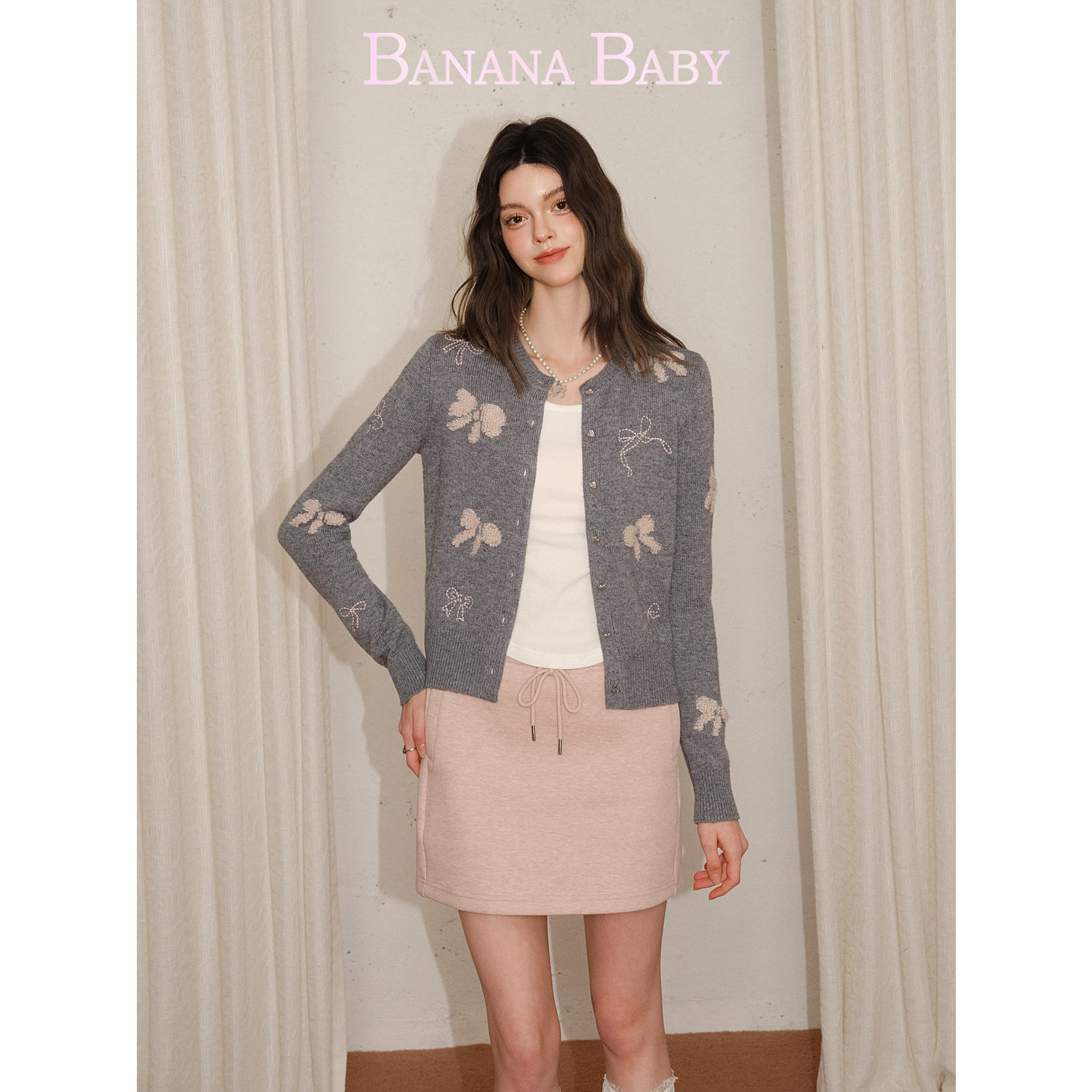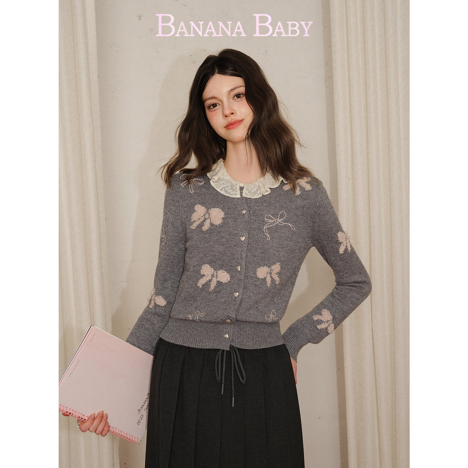 【绵羊毛】BANANA BABY2026年春新款甜美蝴蝶结提花刺绣针织开衫