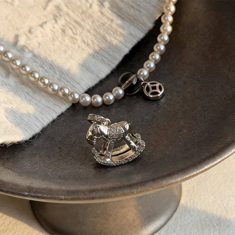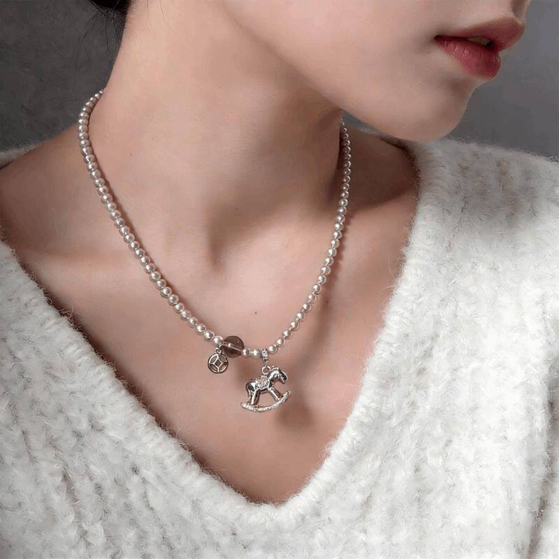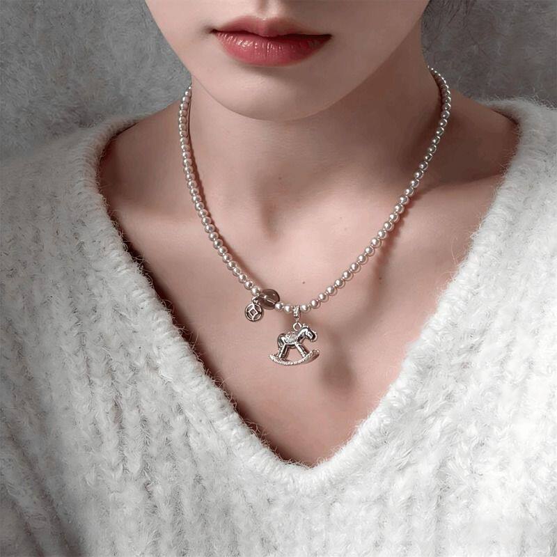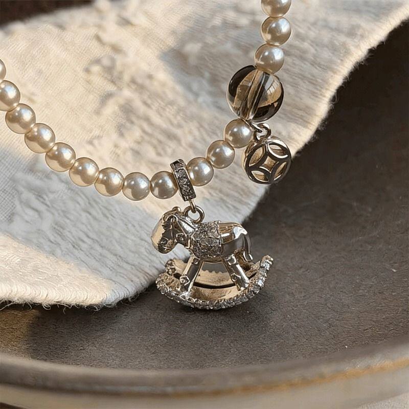 马上有钱金梦木马吊坠毛衣链女仿珍珠款项链本命年锁骨链秋冬配饰