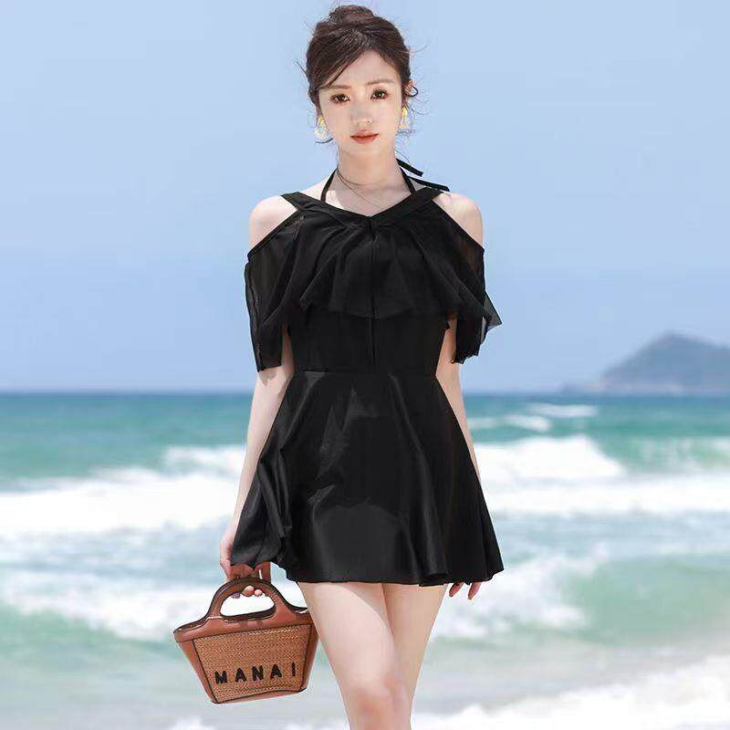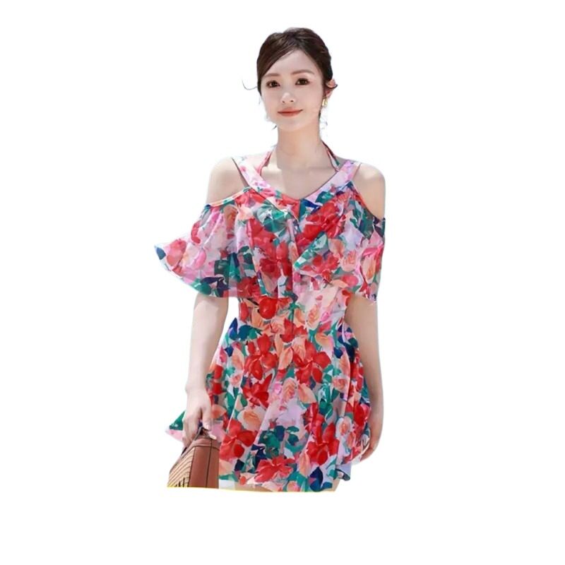 泳衣女泡温泉高级感连体泳衣双肩碎花裙式遮肉保守纯欲游泳衣