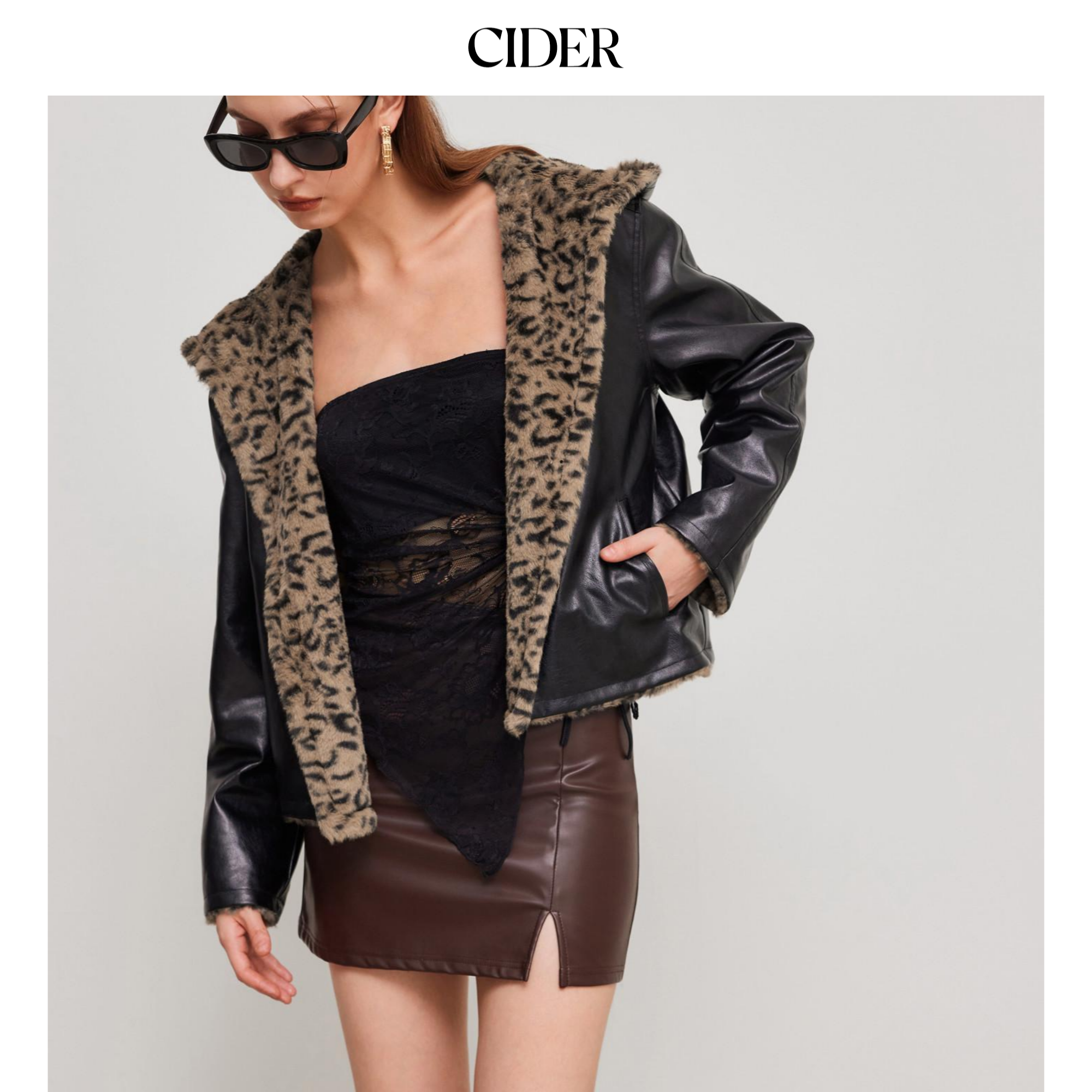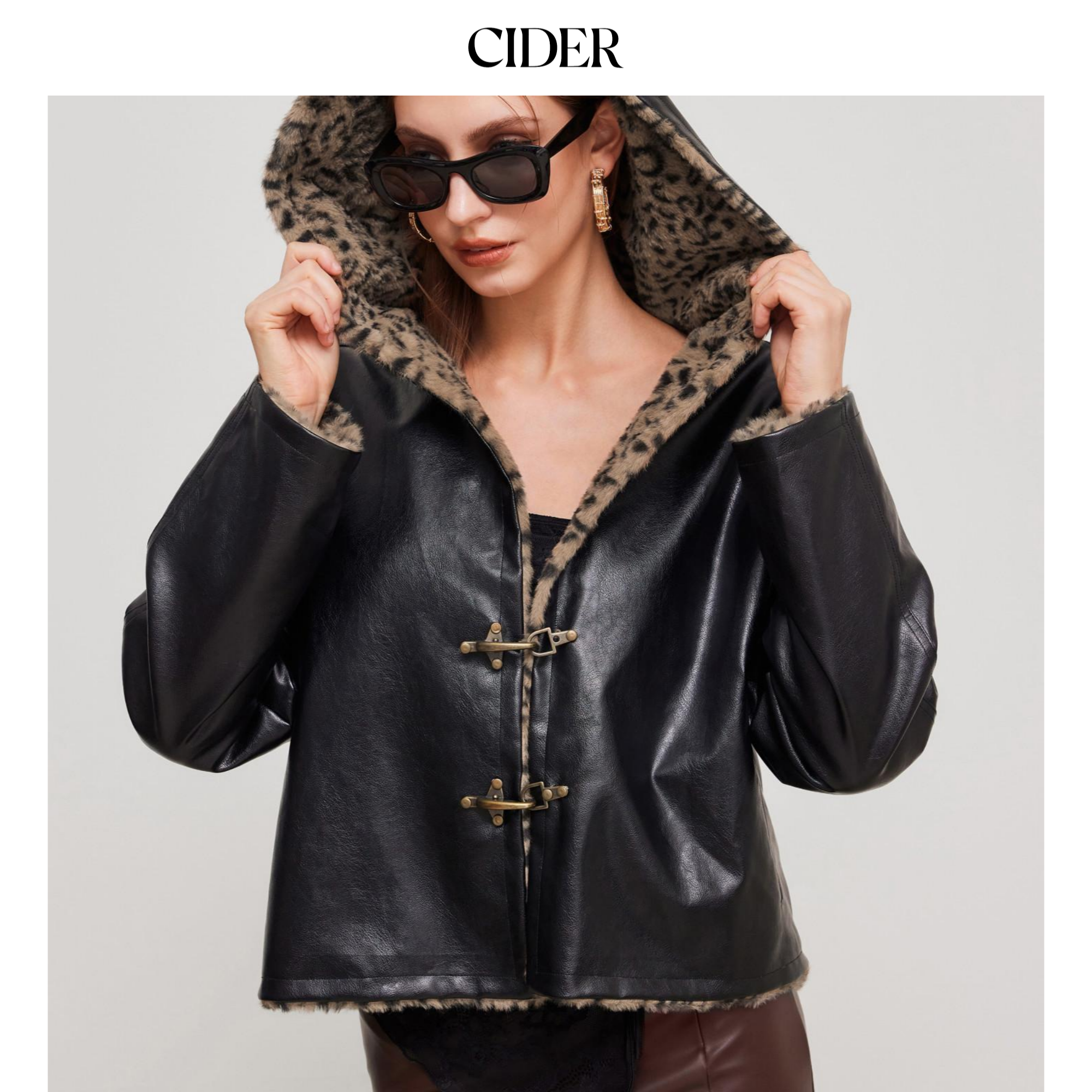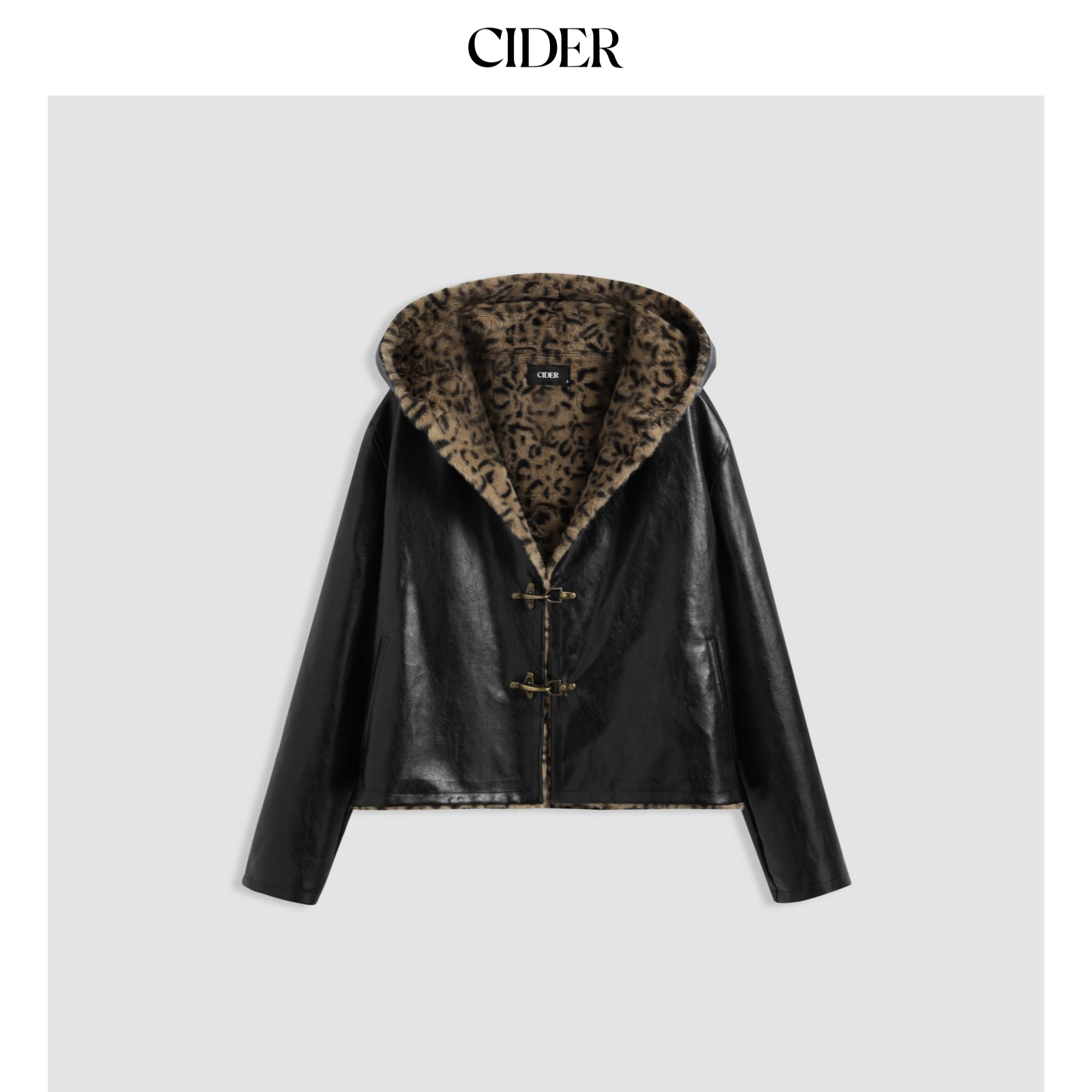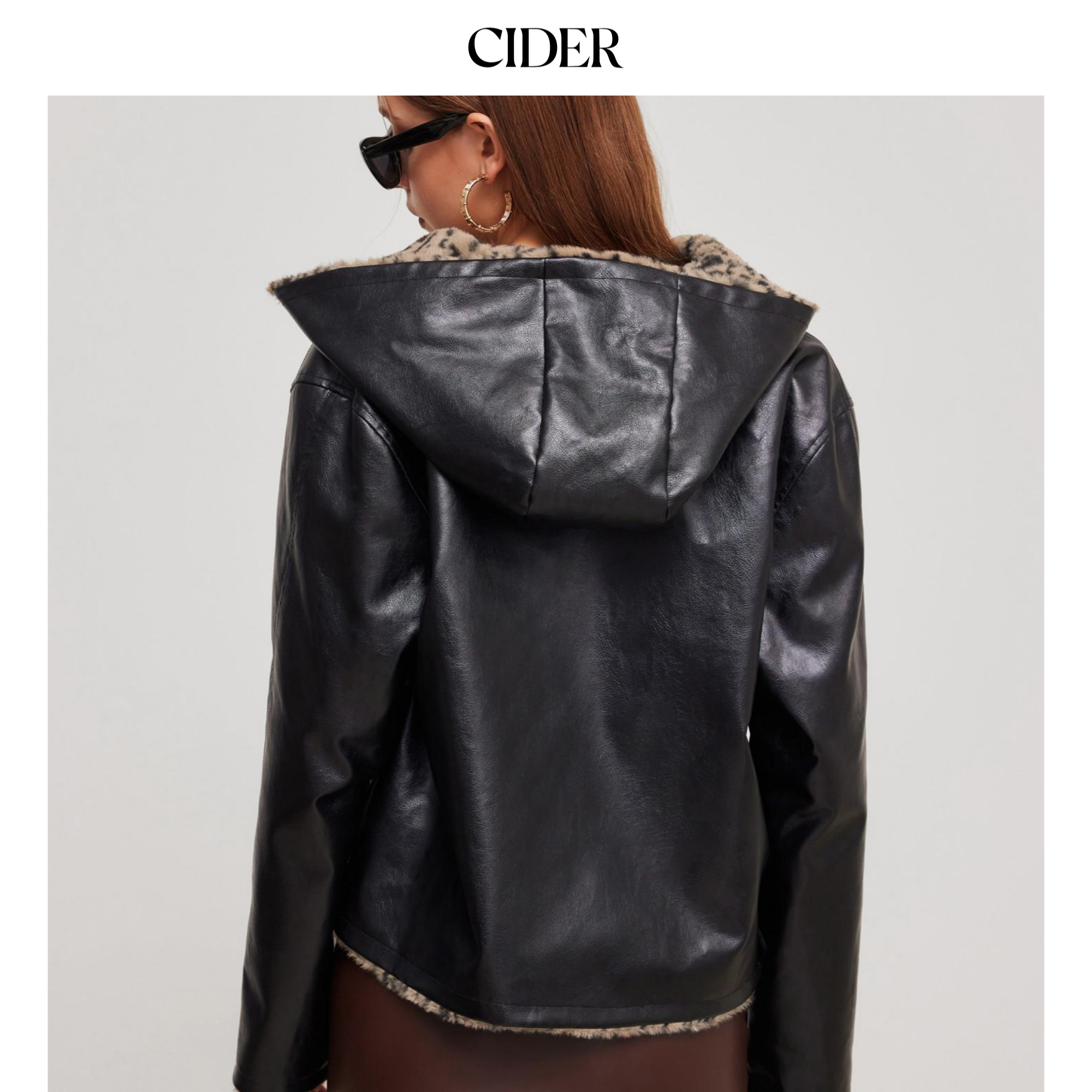 CIDER 秋冬新品女装仿羊羔毛豹纹内衬连帽夹克113813289