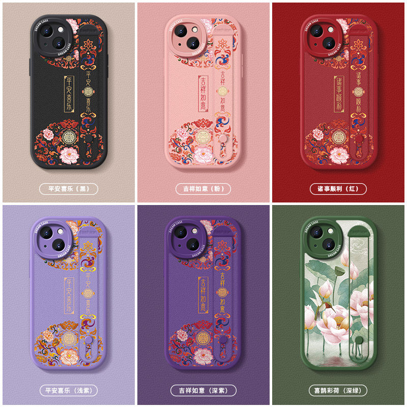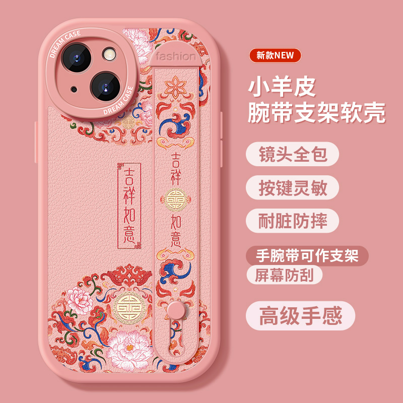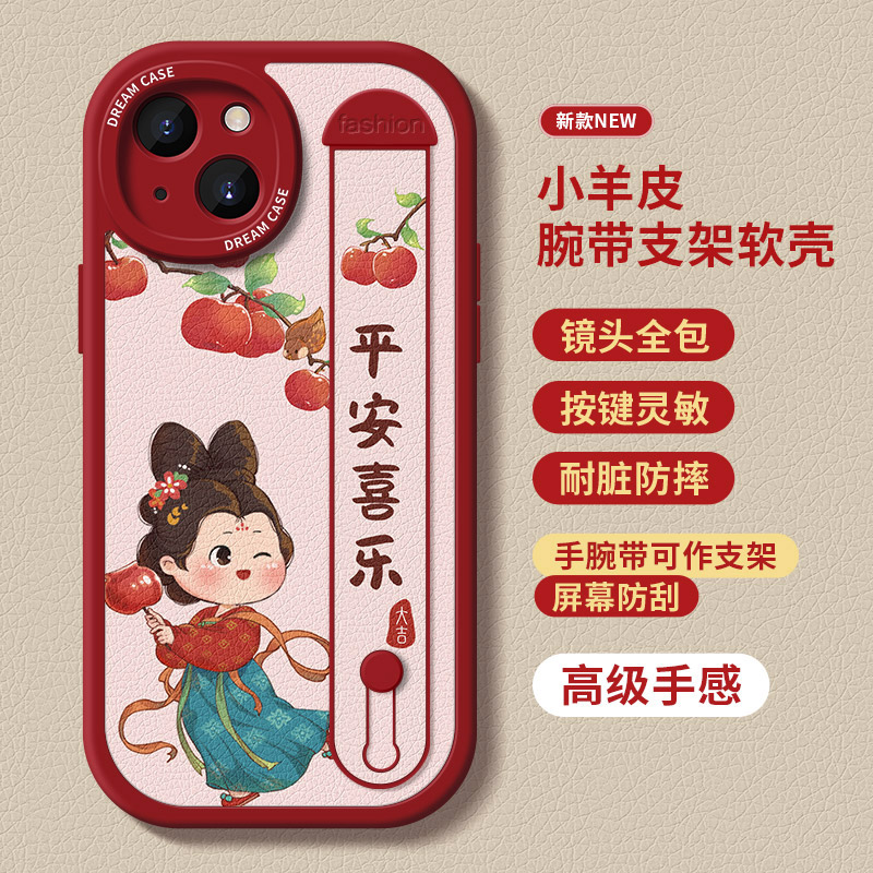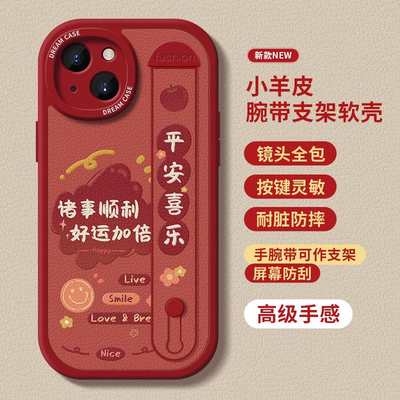 适用苹果13手机壳16女8plus保护壳iphone11腕带12/14/15新款7plus防摔6s全包x手机套xr高级支架pro贴皮红色