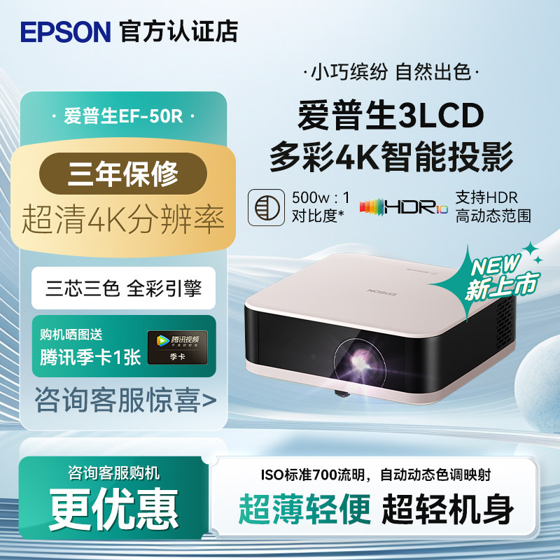 爱普生(EPSON)EF-50T/50R 4K投影仪3LCD智能云台投影机家用超高清便携卧室客厅护眼电视投影