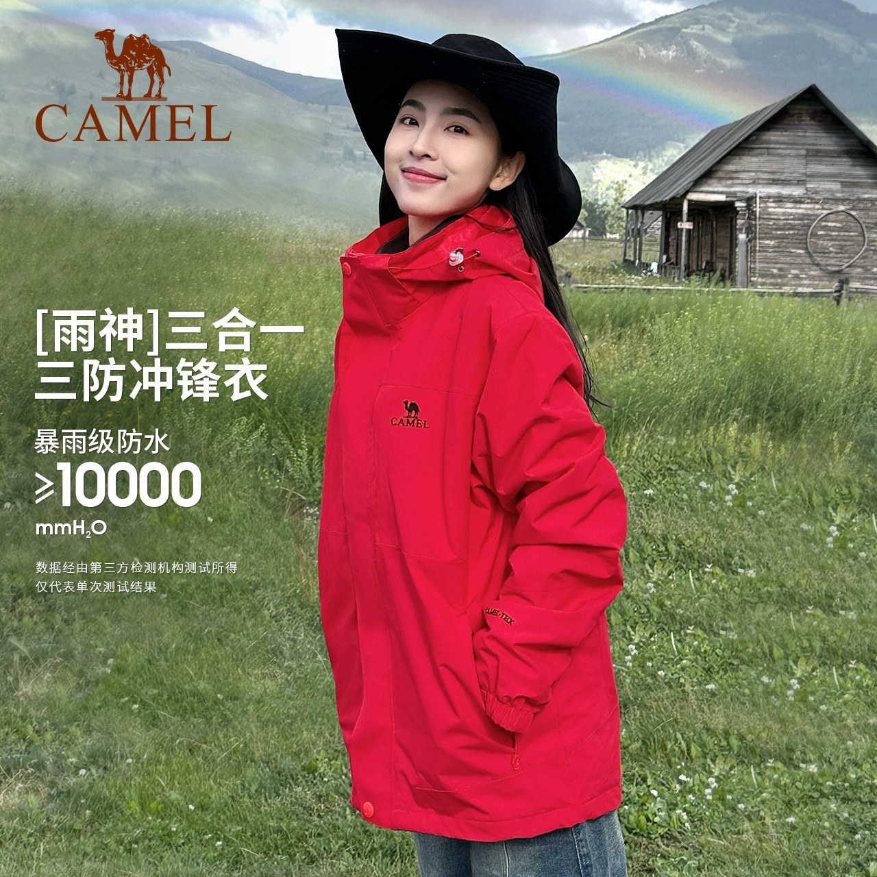 [新年红]骆驼户外3514红色冲锋衣女款三合一冬季外套防水登山服男