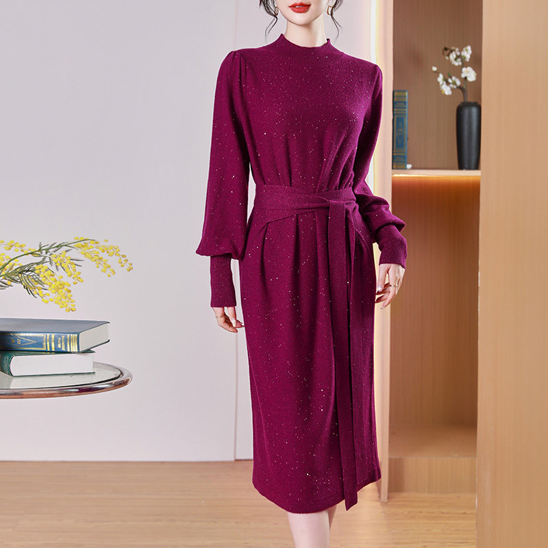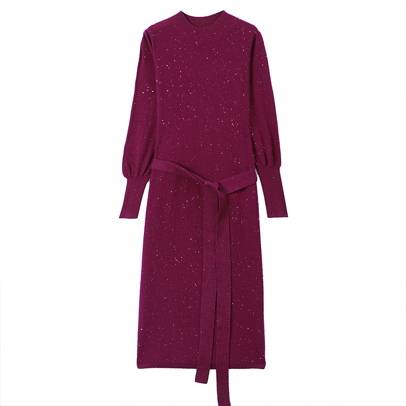 恒源祥纯色翻领羊毛连衣裙女秋冬装新款气质宽松打底中长款毛衣裙
