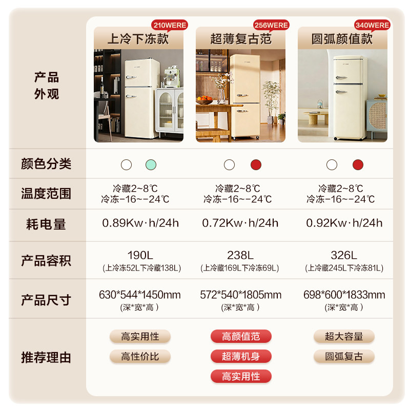 宝帕尼风冷无霜复古两门双门冰箱租房公寓奶油风白色超薄颜值网红