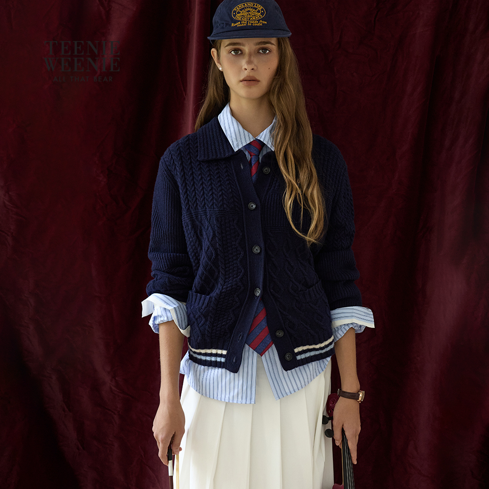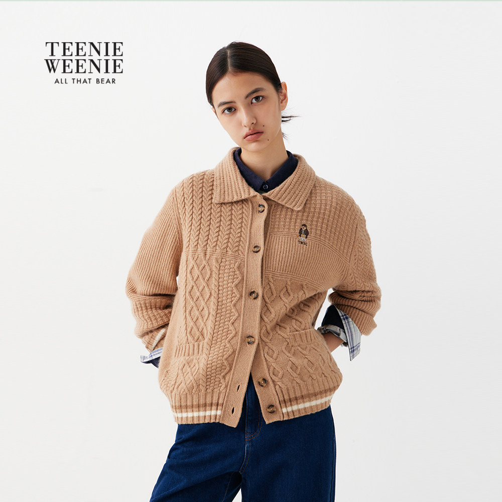 TeenieWeenie小熊女装毛针织衫2025冬季新款宽松舒适拼色翻领开衫