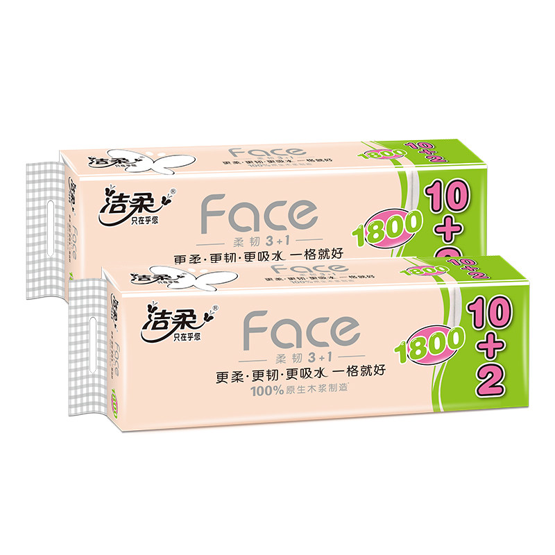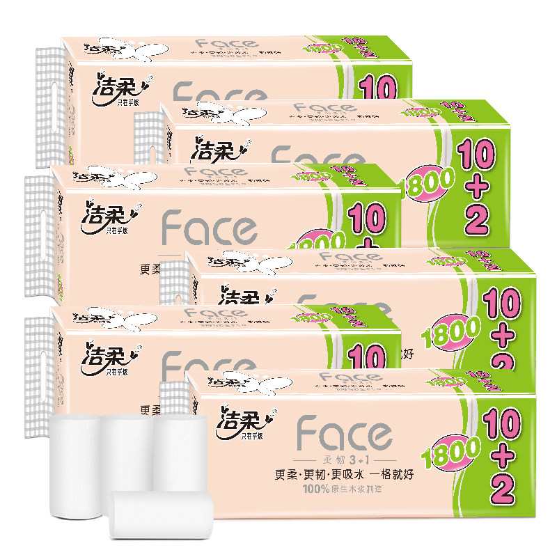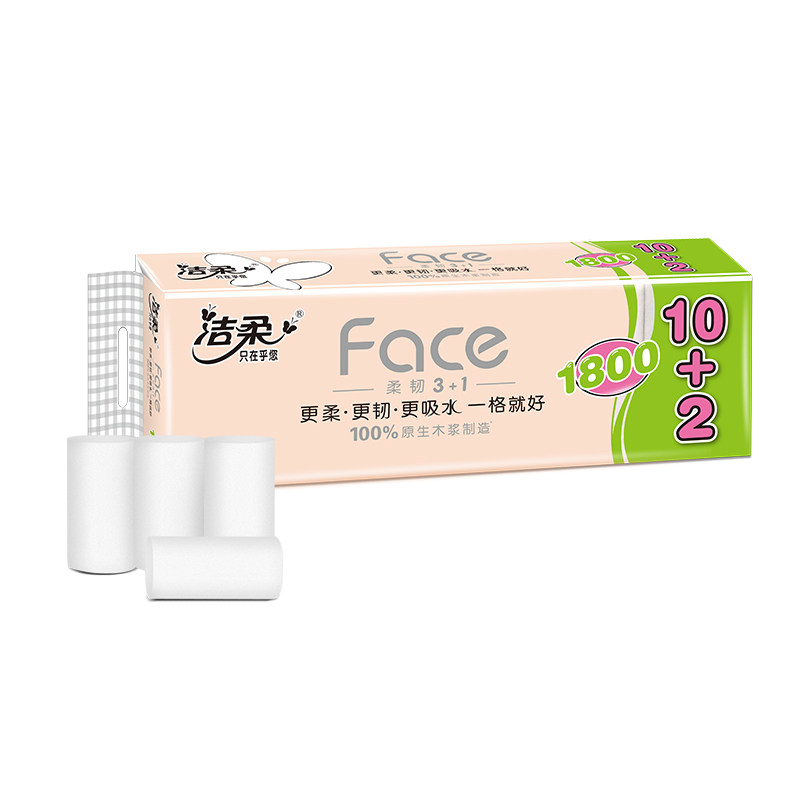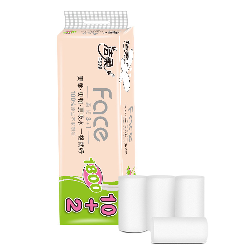 洁柔卷纸家用卫生纸无芯4层长卷纸1800克12卷实心厕纸巾学生有芯