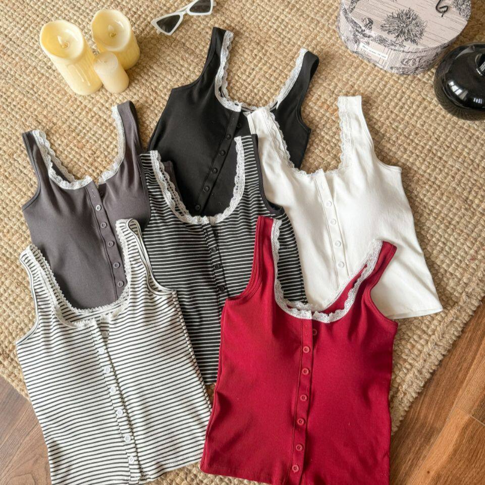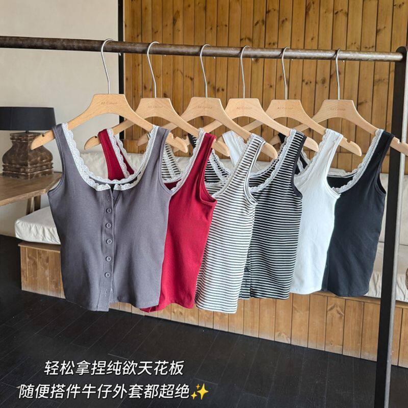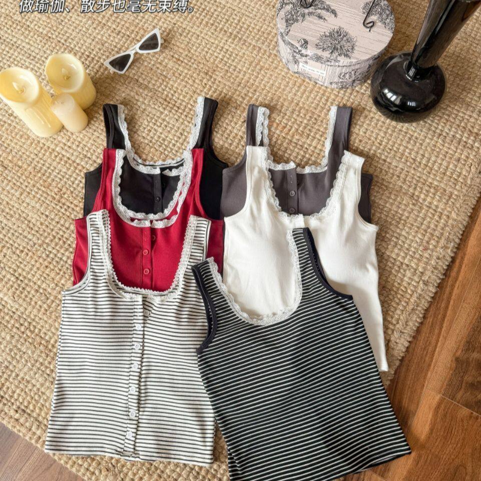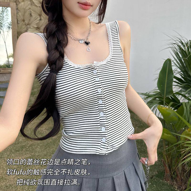 春夏氛围感百搭显瘦蕾丝边设计纽扣款条纹美背纯欲带胸垫背心上衣