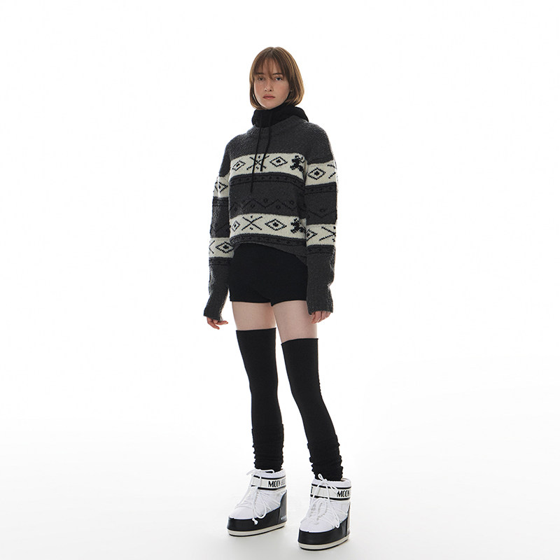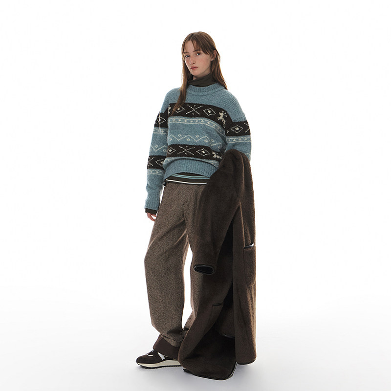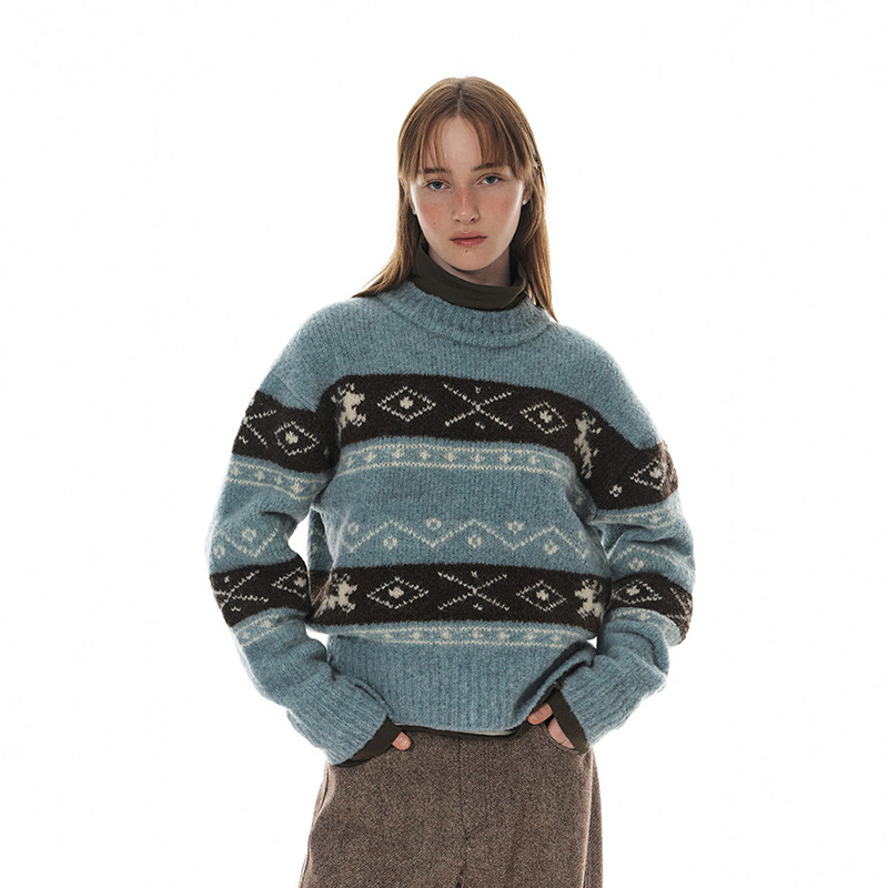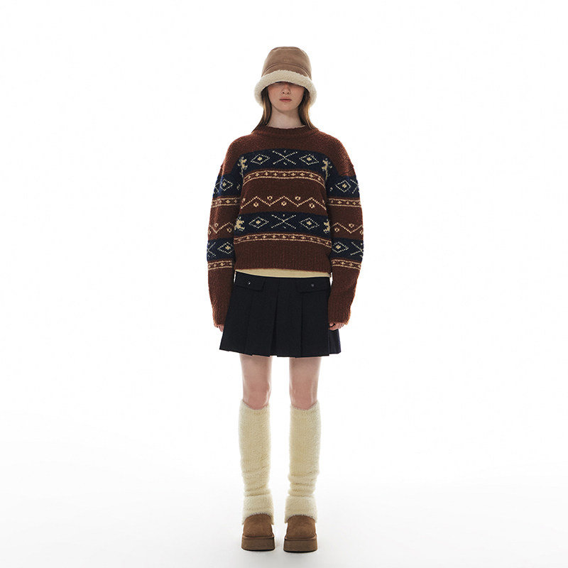 GROVE官方旗舰店明星同款冬费尔岛麋鹿提花毛织套头复古撞色毛衣