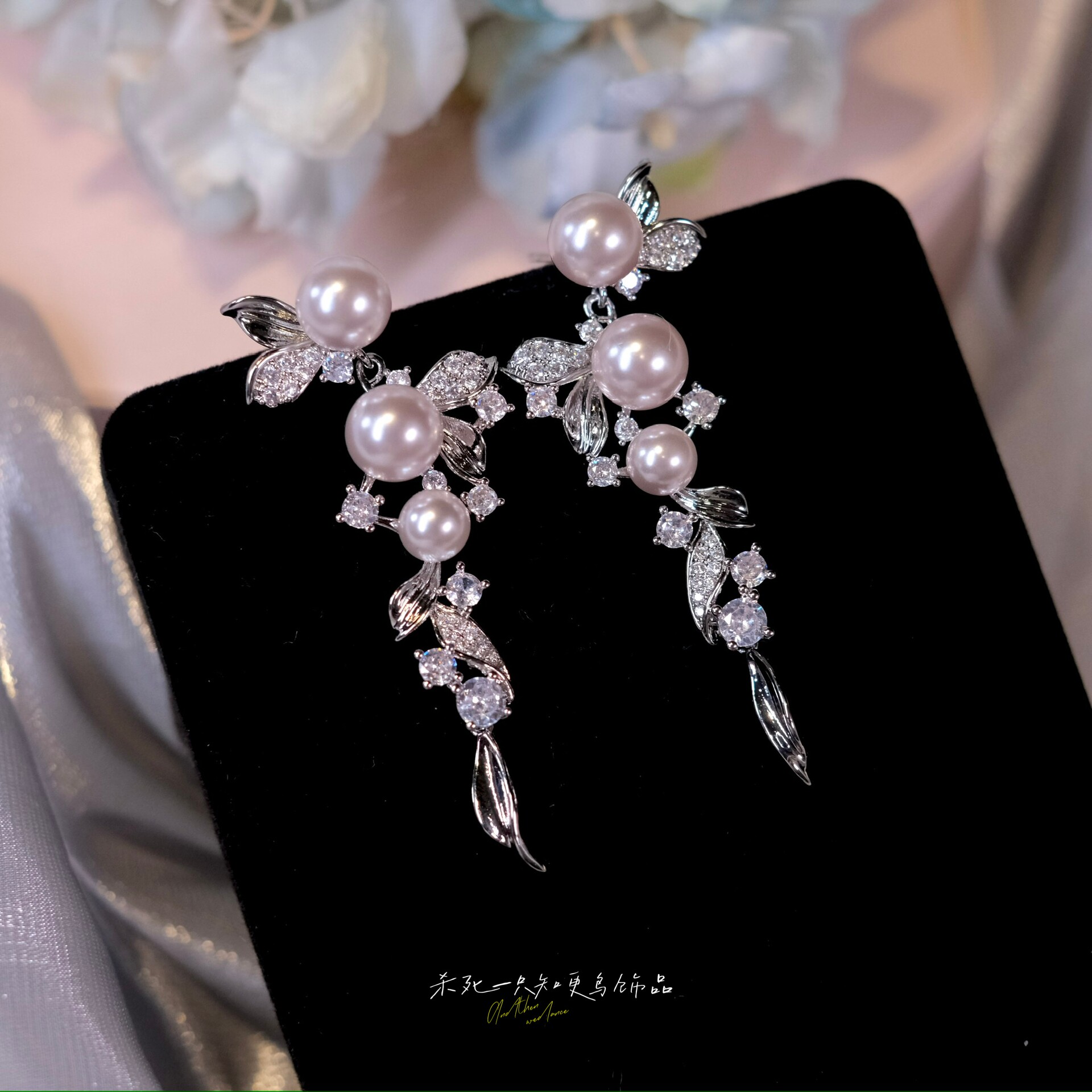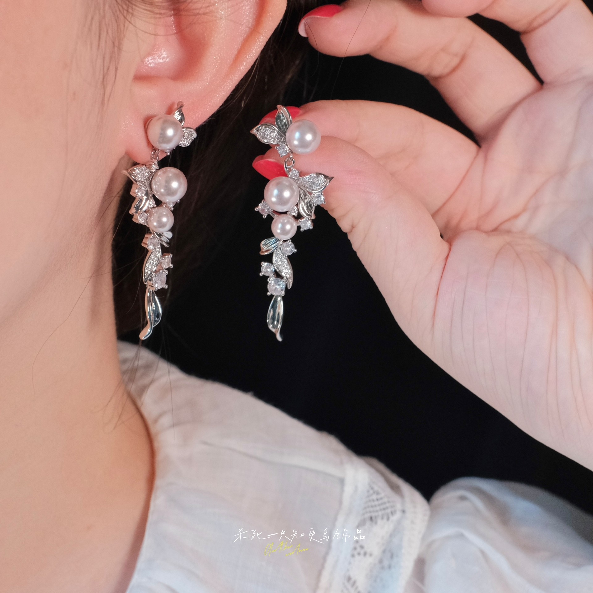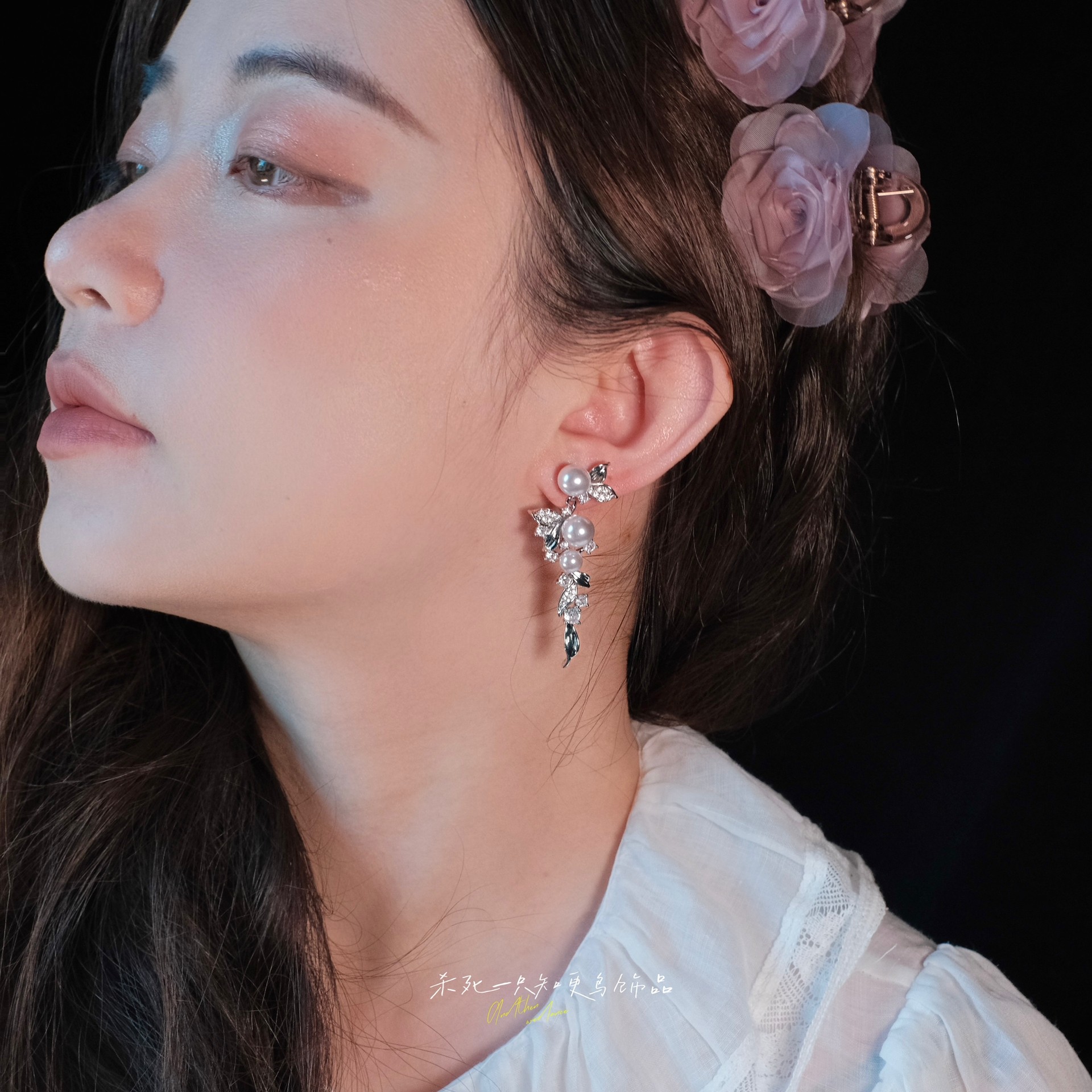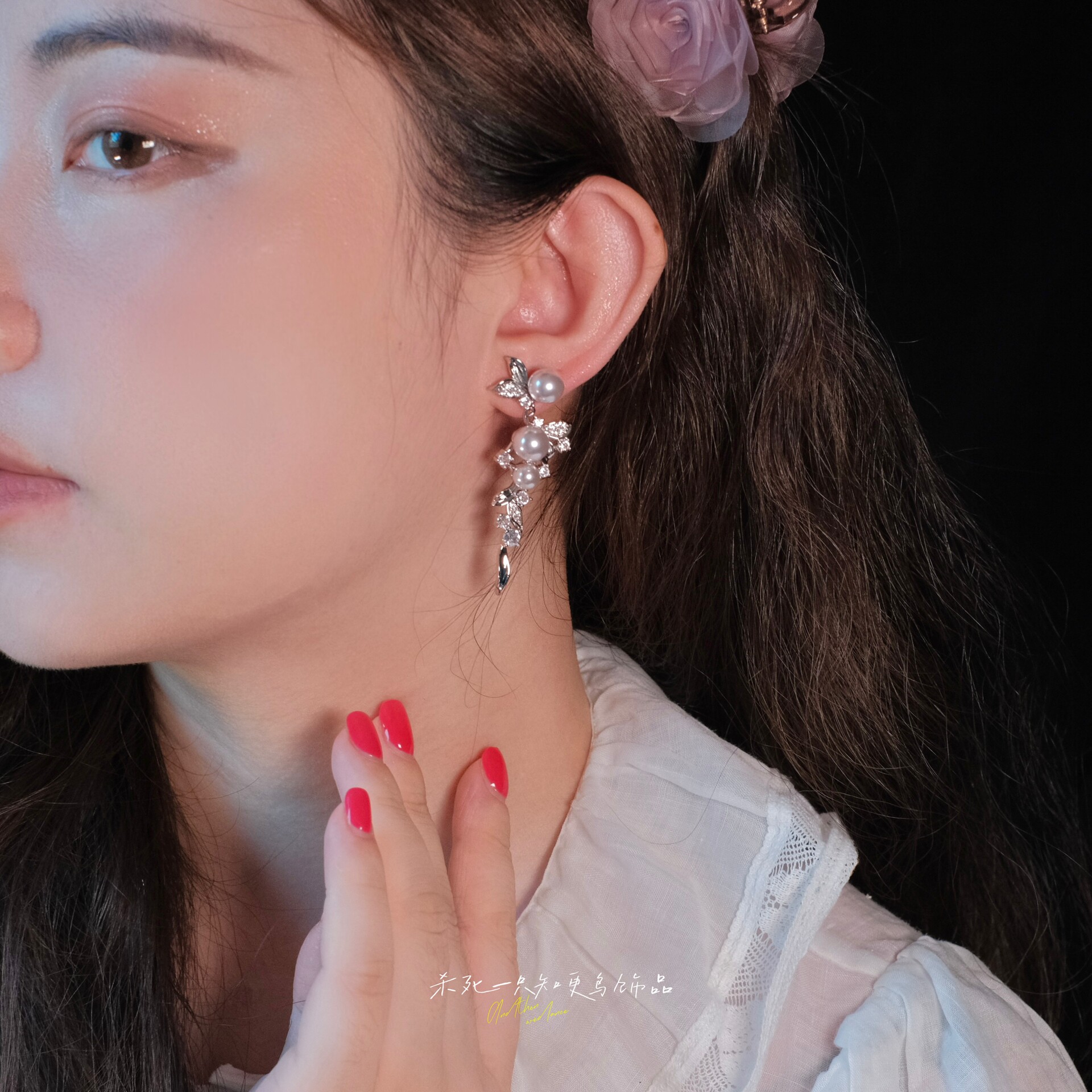 《暮色回响》法式优雅宫廷风闪耀锆石长流苏曼塔玫瑰珍珠耳环耳夹