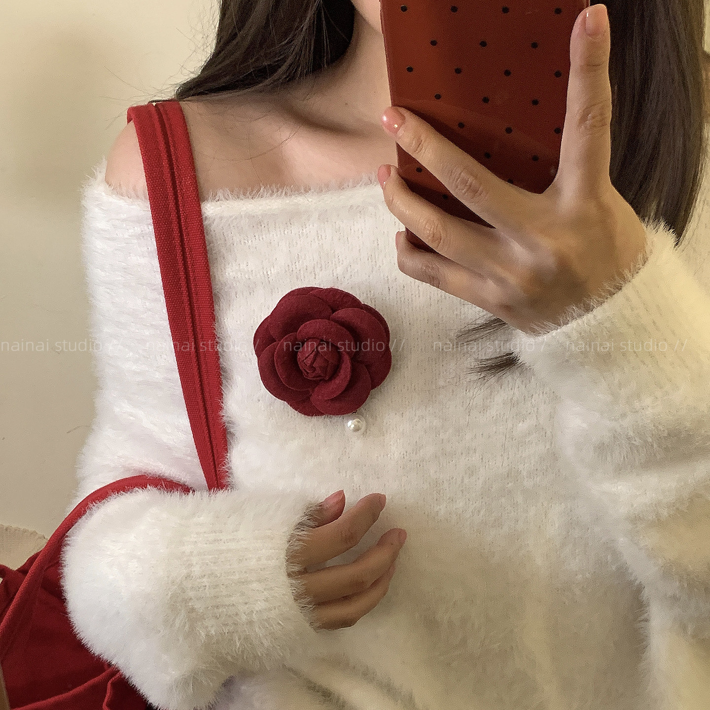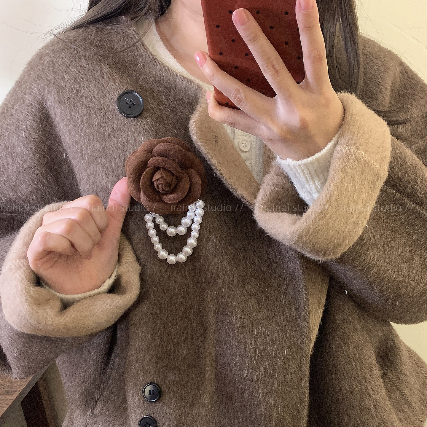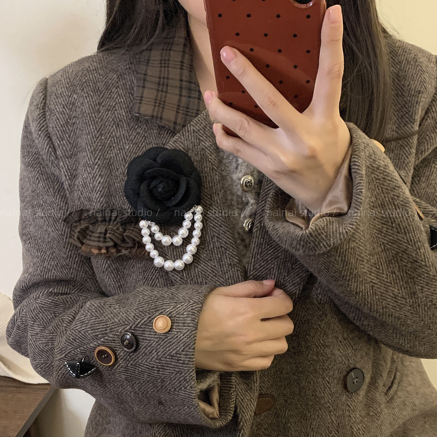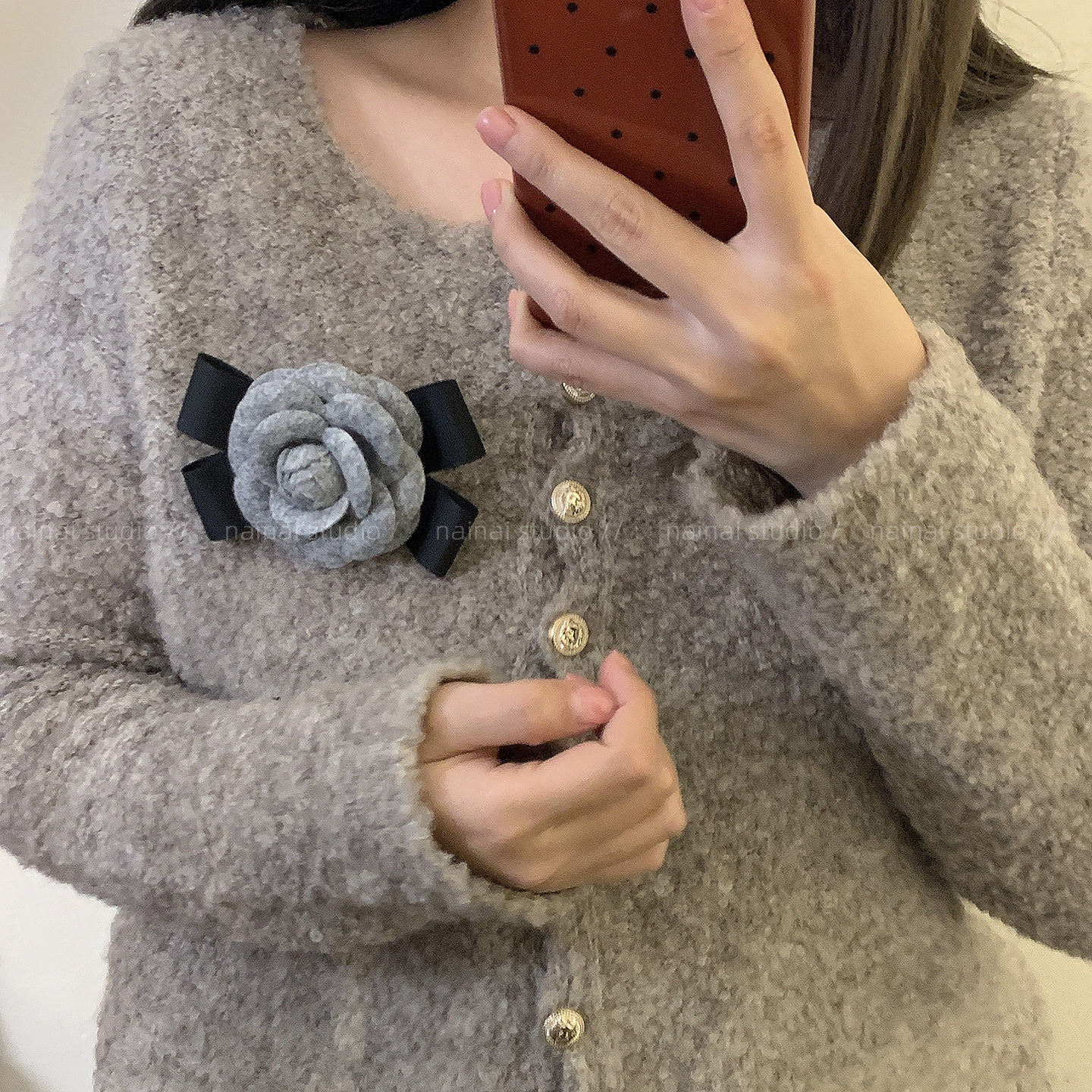 毛呢山茶花胸针~珍珠吊装复古法式2025秋冬新款蝴蝶结胸花别针女A
