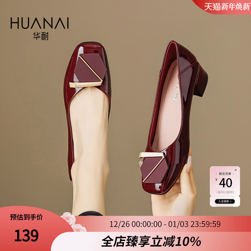 华耐粗跟单鞋女2025新款浅口高跟鞋女鞋酒红色妈妈鞋喜婆婆婚宴鞋