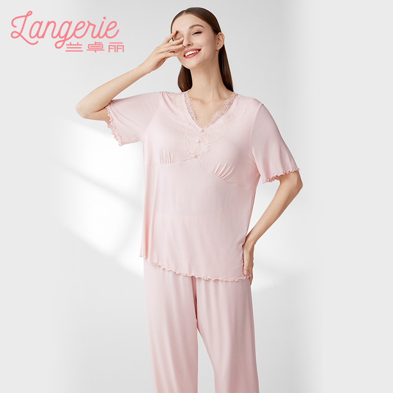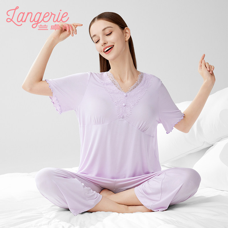 兰卓丽女士家居服上下套装短袖带杯垫防凸点睡衣舒适可外穿夏季款