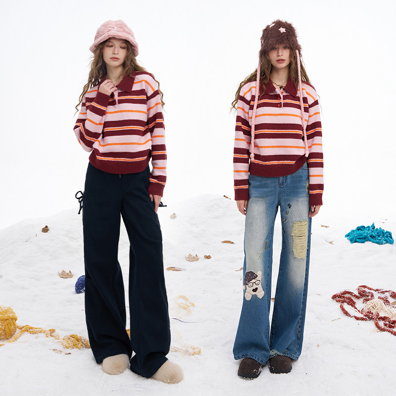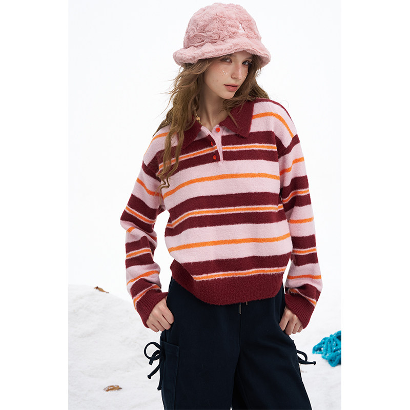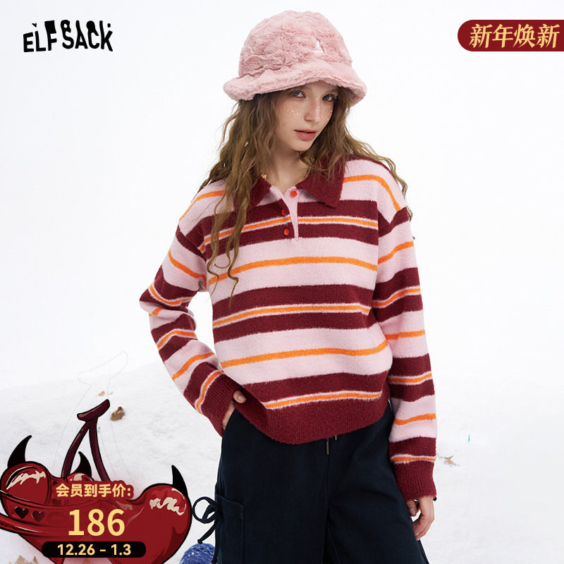 妖精的口袋polo领条纹撞色休闲毛衣女2025年冬季新款慵懒风显瘦