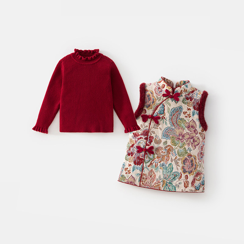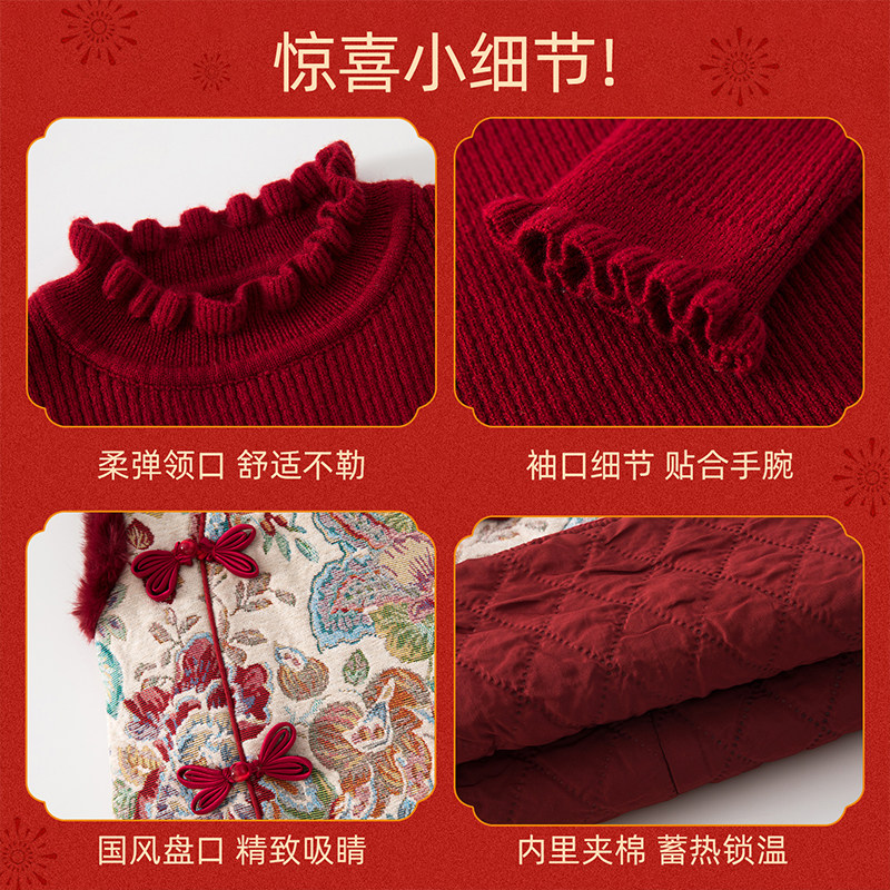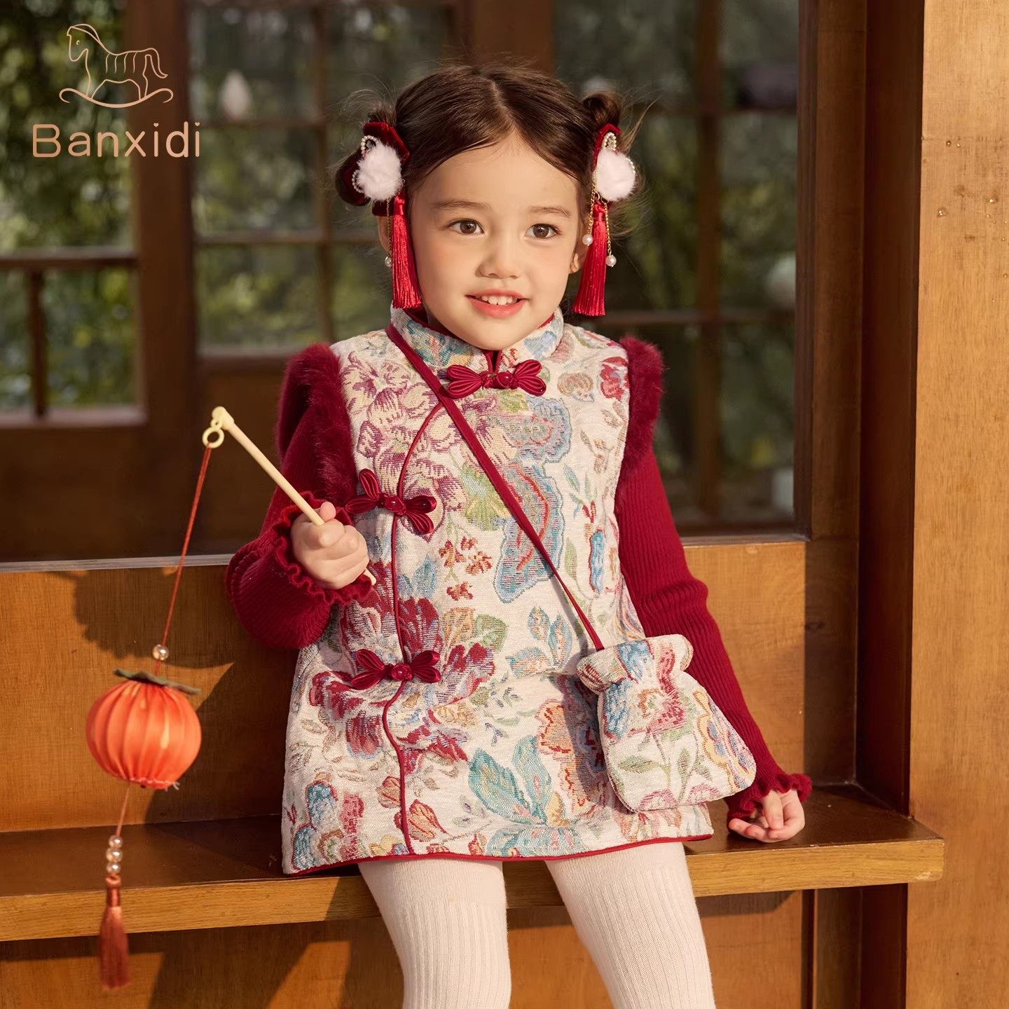 班喜迪女童汉服拜年服冬装宝宝周岁礼服套装儿童新中式旗袍裙唐装
