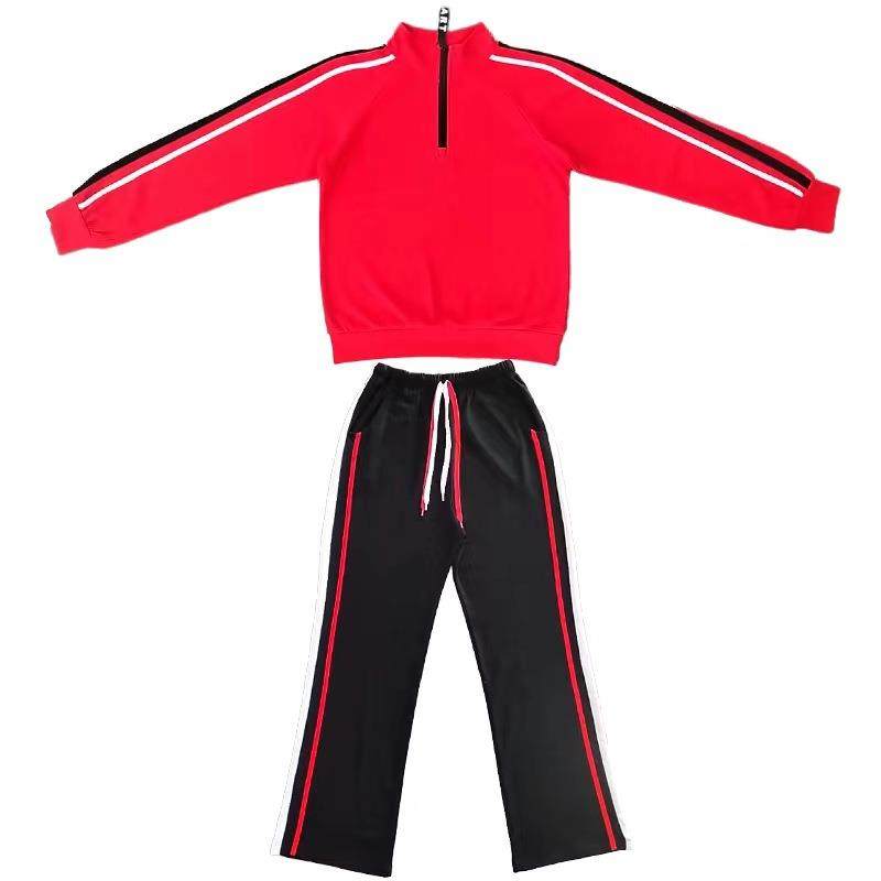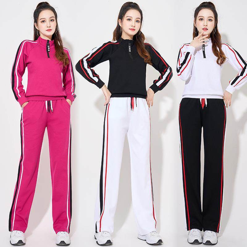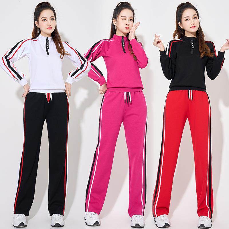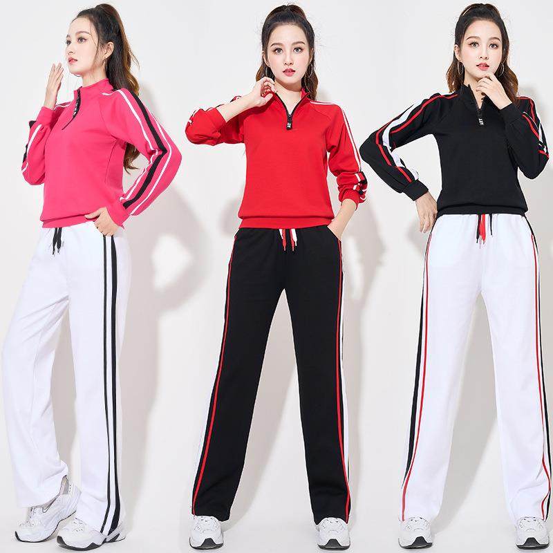广场舞服装2023新款半拉链双条纹套装运动舞蹈表演跳操团体服女