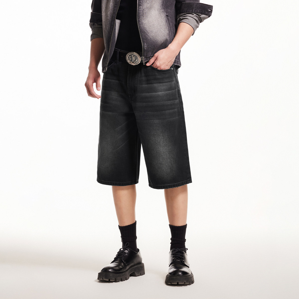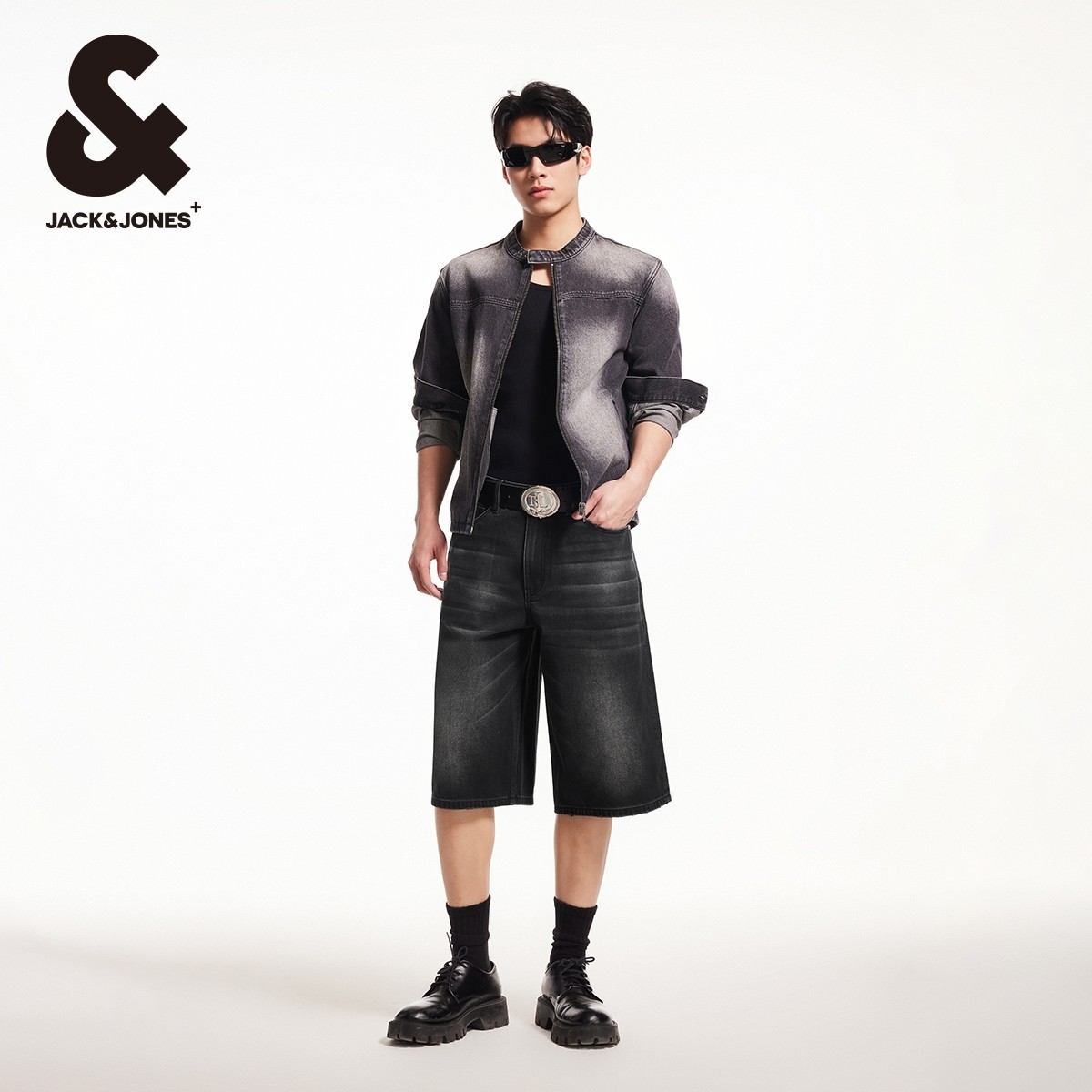 杰克琼斯男装25年夏新款黑灰色宽松猫须水洗廓形牛仔短裤子七分裤