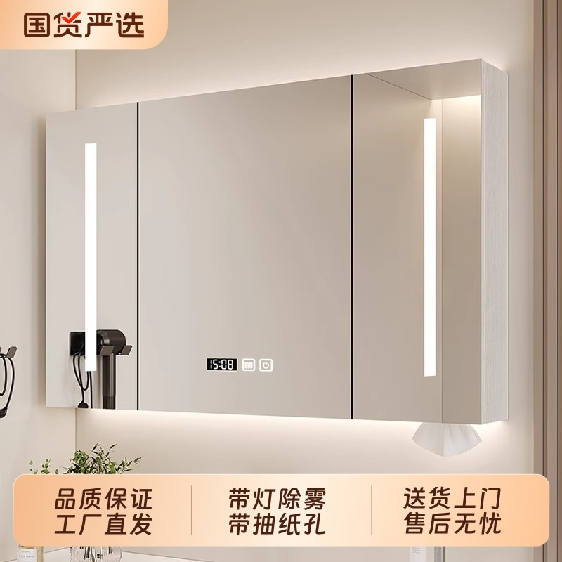 新款智能浴室镜柜带灯除雾卫生间镜子单独挂墙式收纳储物镜箱防雾