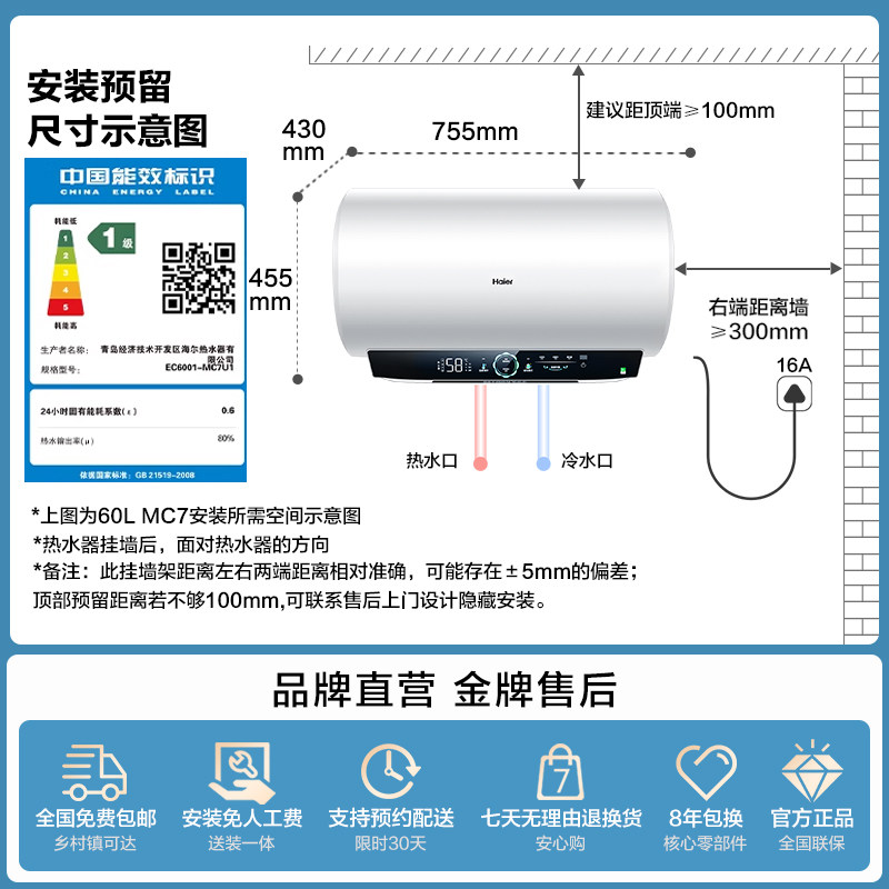 海尔电热水器家用速热大容量一级能效卫生间洗澡80升60升MC7