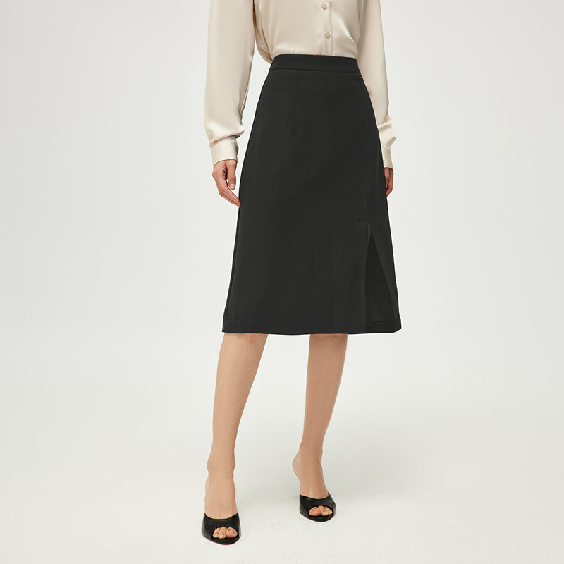 HLA/海澜之家雪纺黑色半身裙25春夏新职场通勤修身开叉直筒裙女装