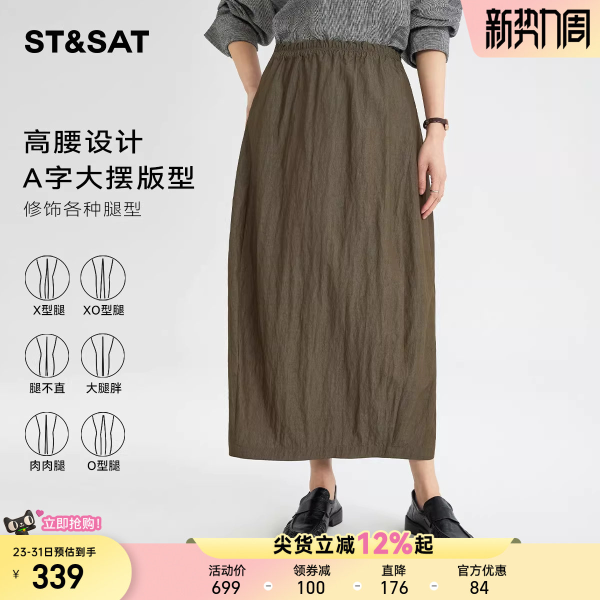 森马半身裙女夏季松紧腰肌理垂感分割A字裙宽松松弛感山本风长裙