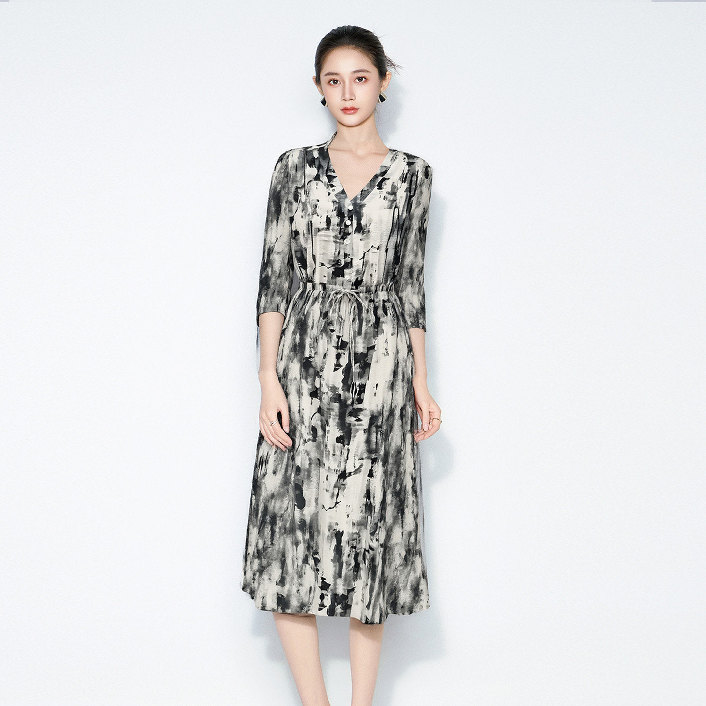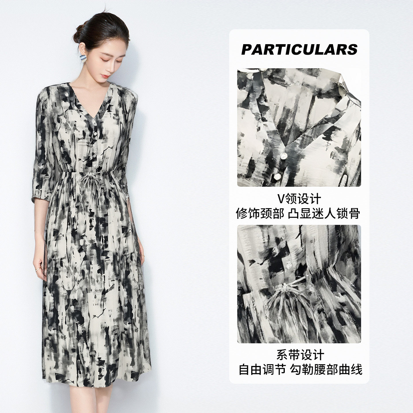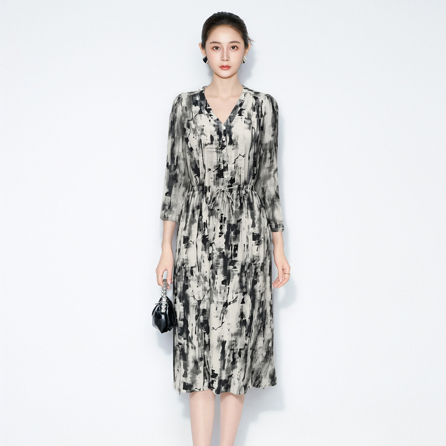 马天奴秋冬女装水墨灰V领印花连衣裙子系带收腰气质时尚流行百搭