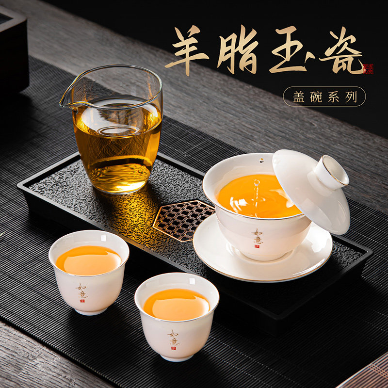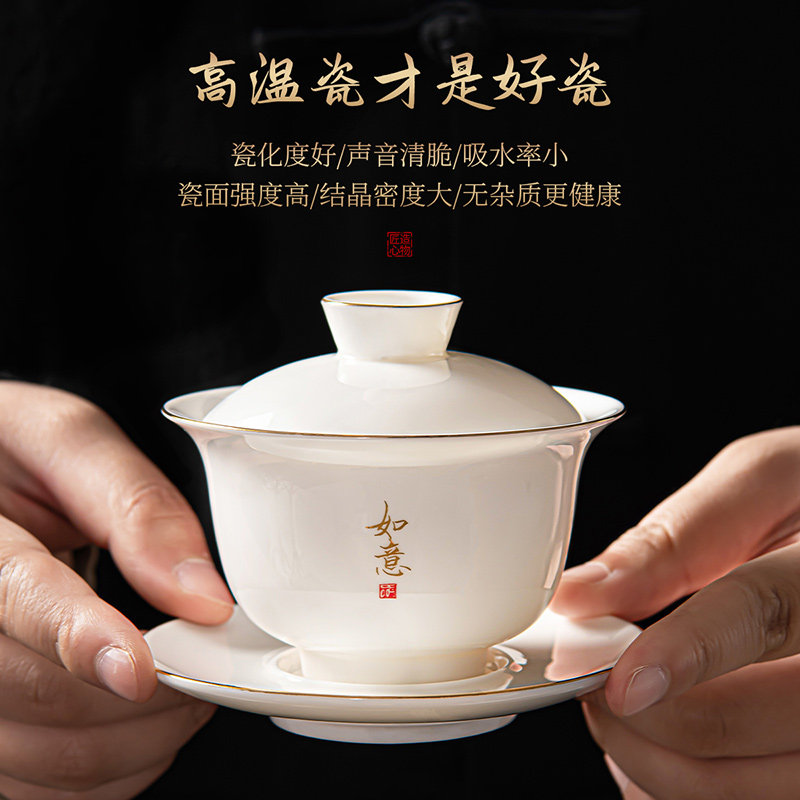 德化白瓷三才盖碗茶杯家用单个高档不烫手个人专用泡茶碗功夫茶具