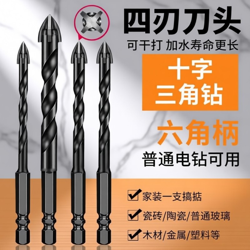 瓷砖钻头打孔混凝土四刃霸王全瓷玻璃专用十字三角钻钨钢冲击6mm