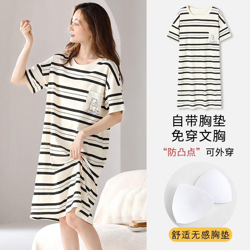 夏季卡通睡裙女长款睡衣一体短袖小个子家居服带胸垫可外穿薄款