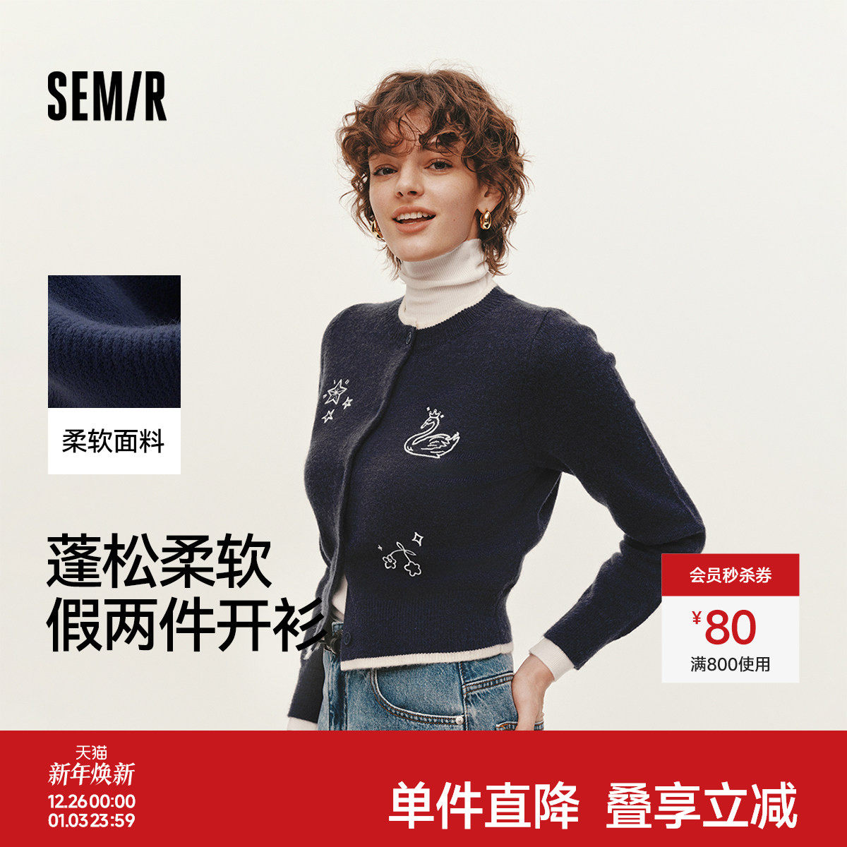陈都灵同款森马针织衫女冬季短款绣花毛衣假两件2025新款小众上衣