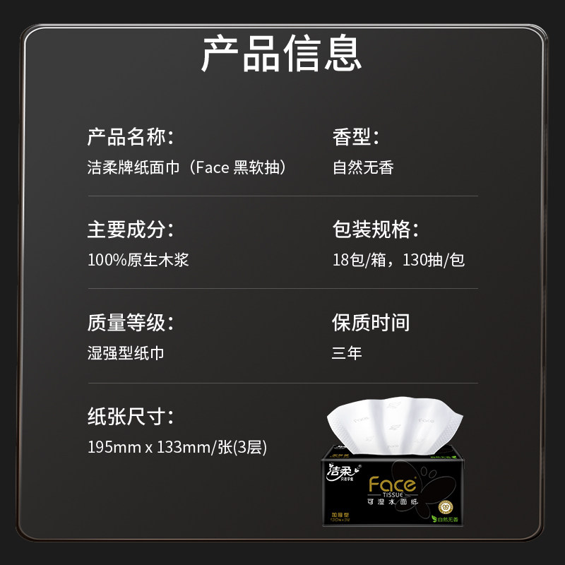 洁柔抽纸黑face130抽家用卫生纸18包实惠无香可湿水面巾纸荧光