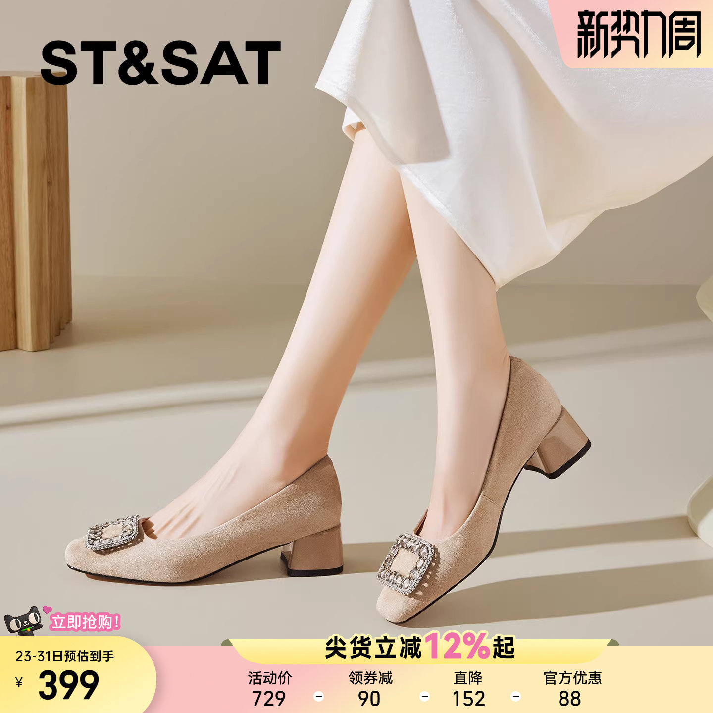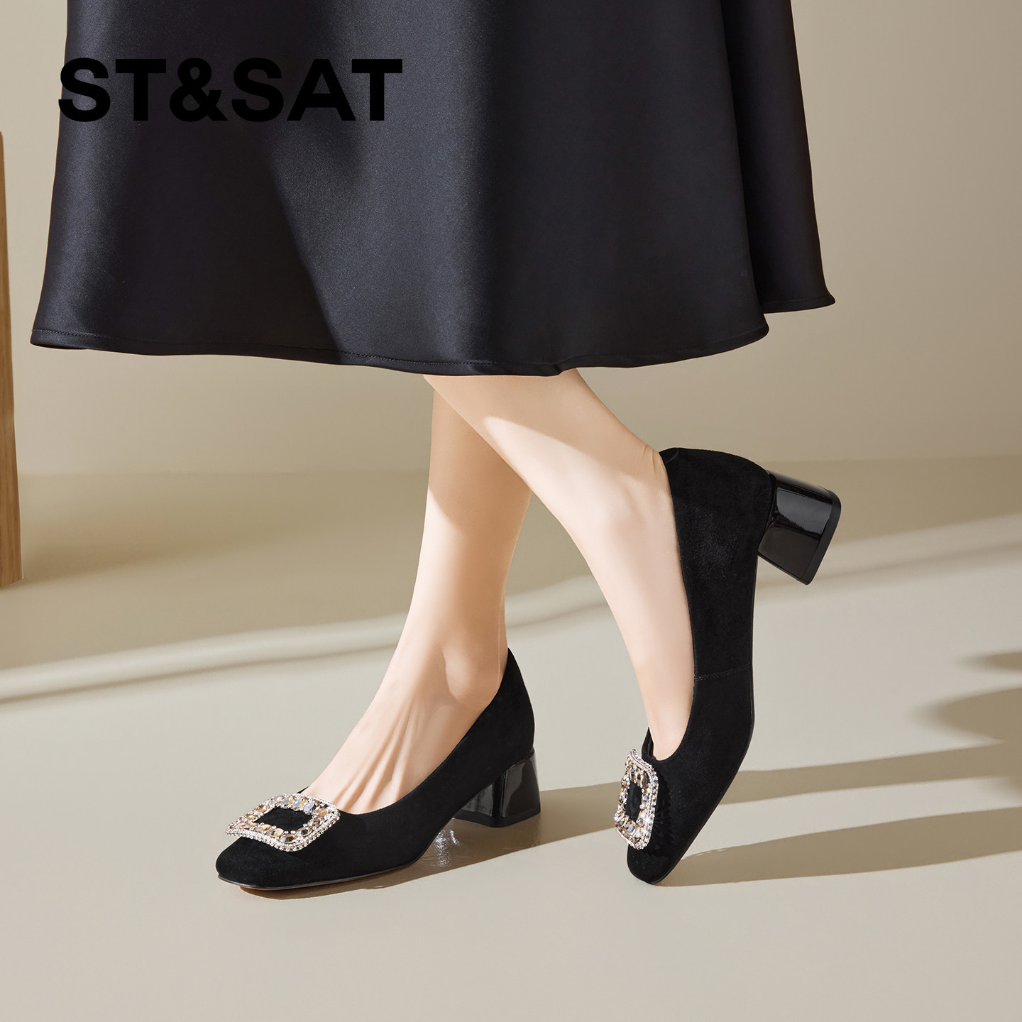 星期六真皮优雅风浅口单鞋女2026春季新款方头粗跟水钻通勤工作鞋