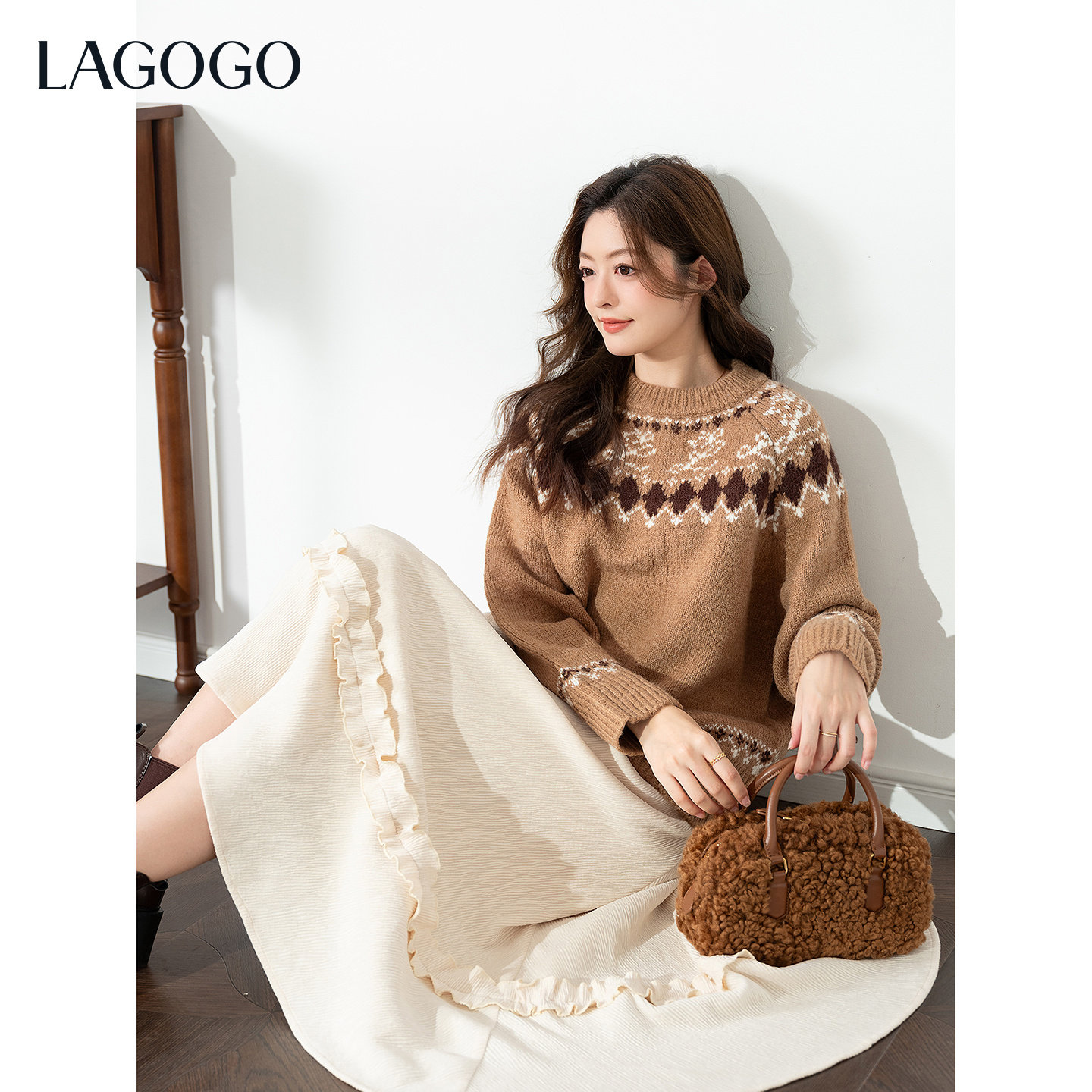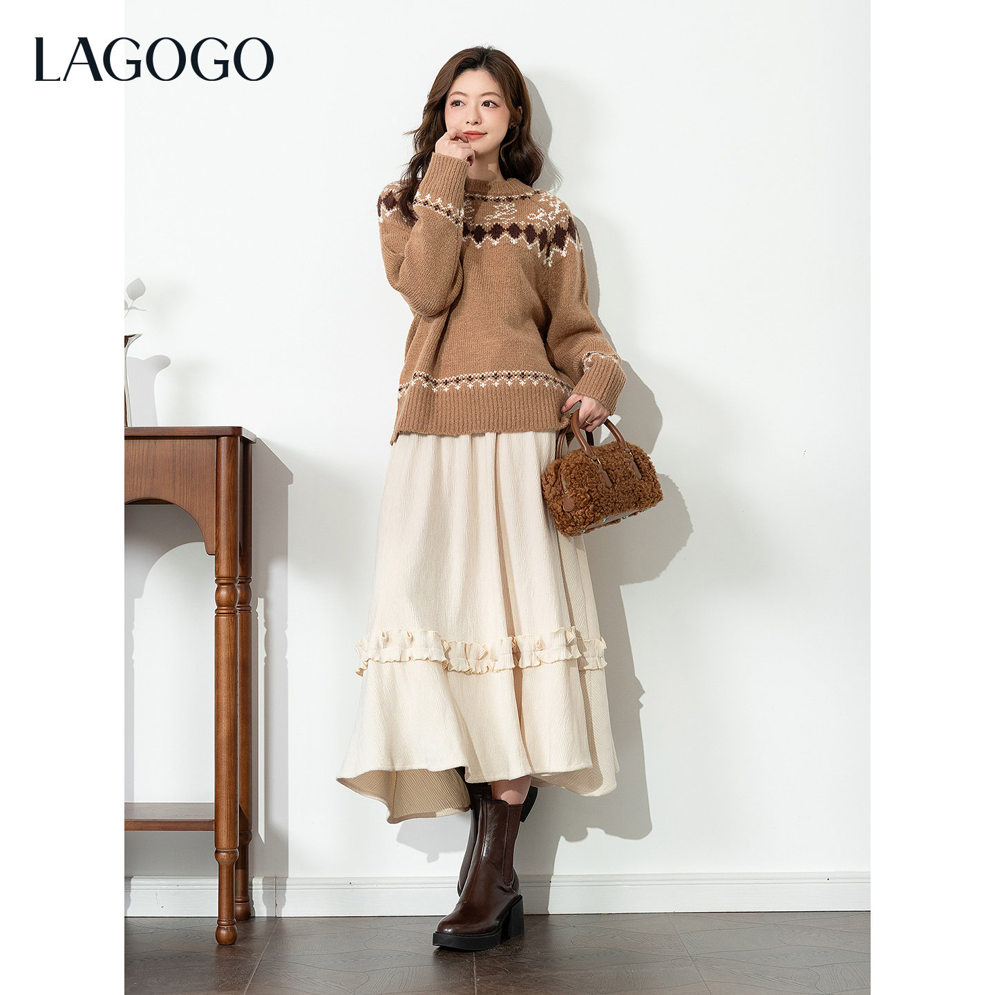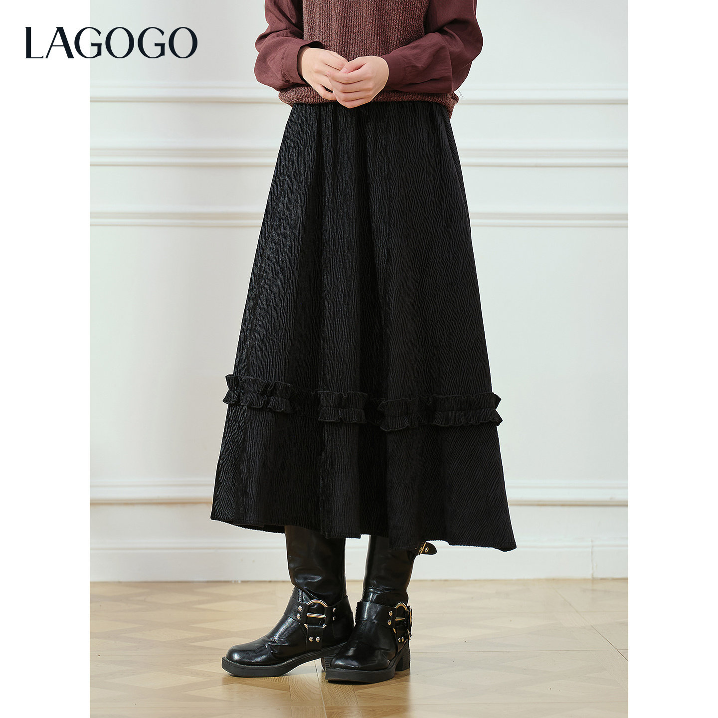 LAGOGO丝绒蛋糕花边优雅半身裙女拉谷谷2025冬季新款小个子A字裙