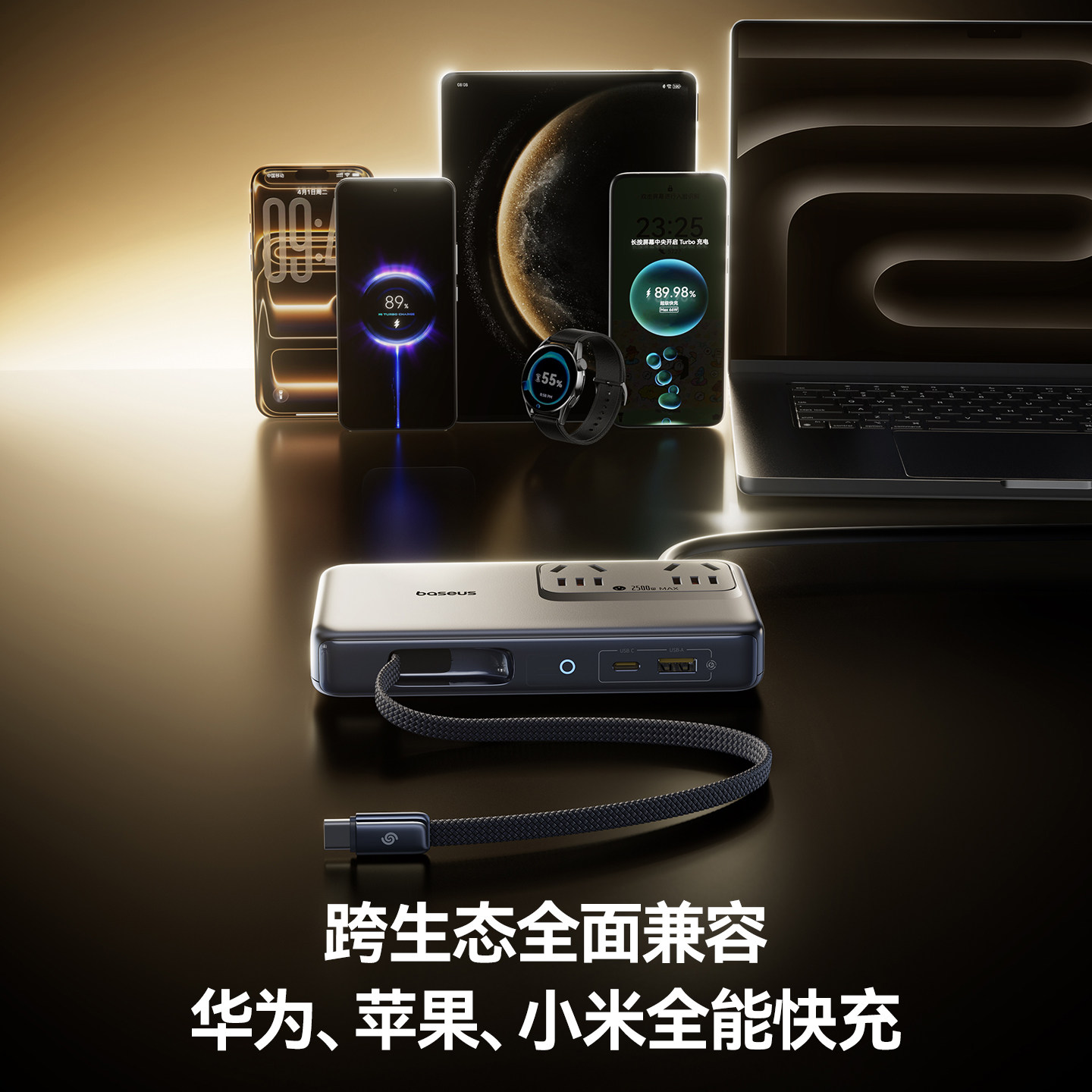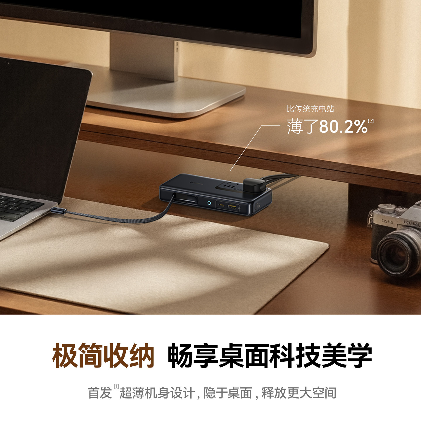倍思67W超薄便携桌面充电站氮化镓插座插排多口快充适用华为小米苹果17手机笔记本充电器插线板带伸缩数据线