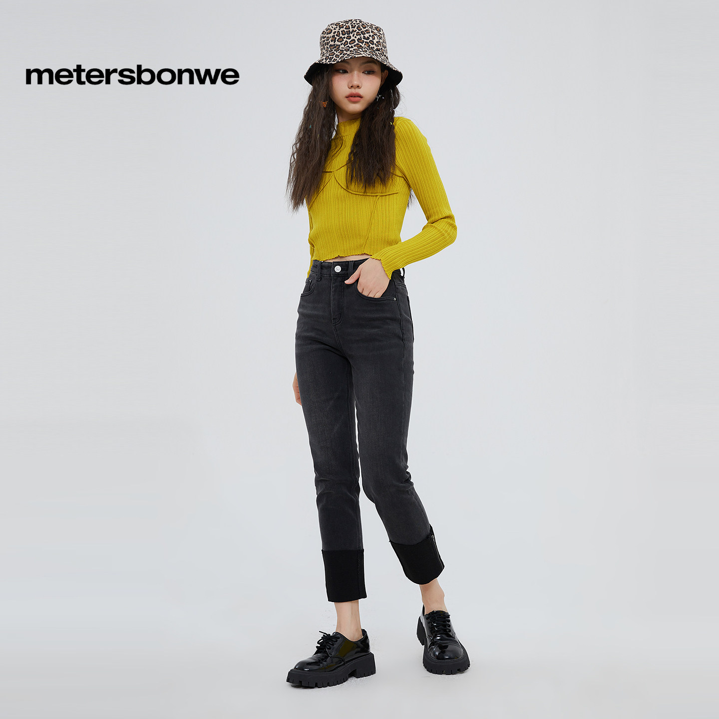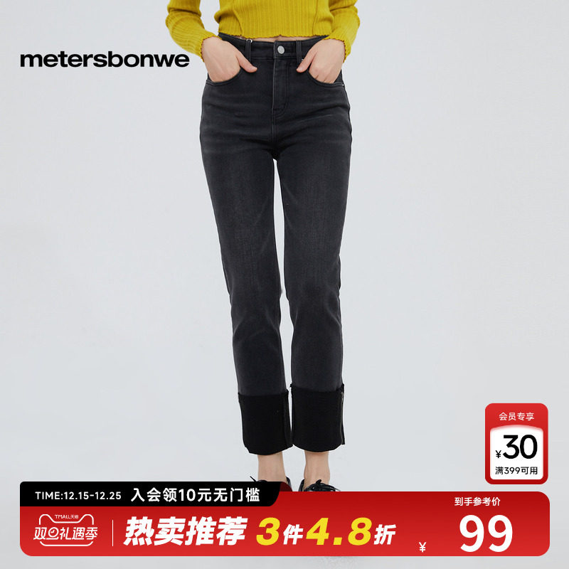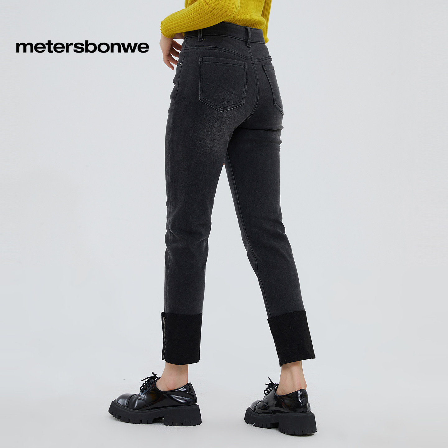 美特斯邦威牛仔长裤女秋冬脚口翻边紧身弹力抓绒洗水牛仔裤子女