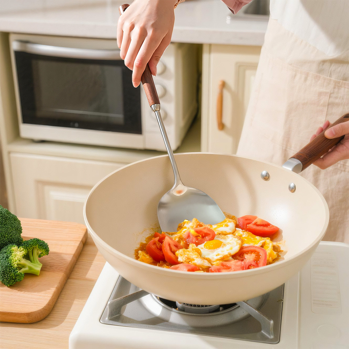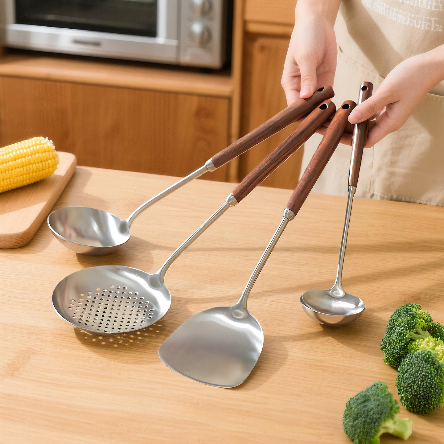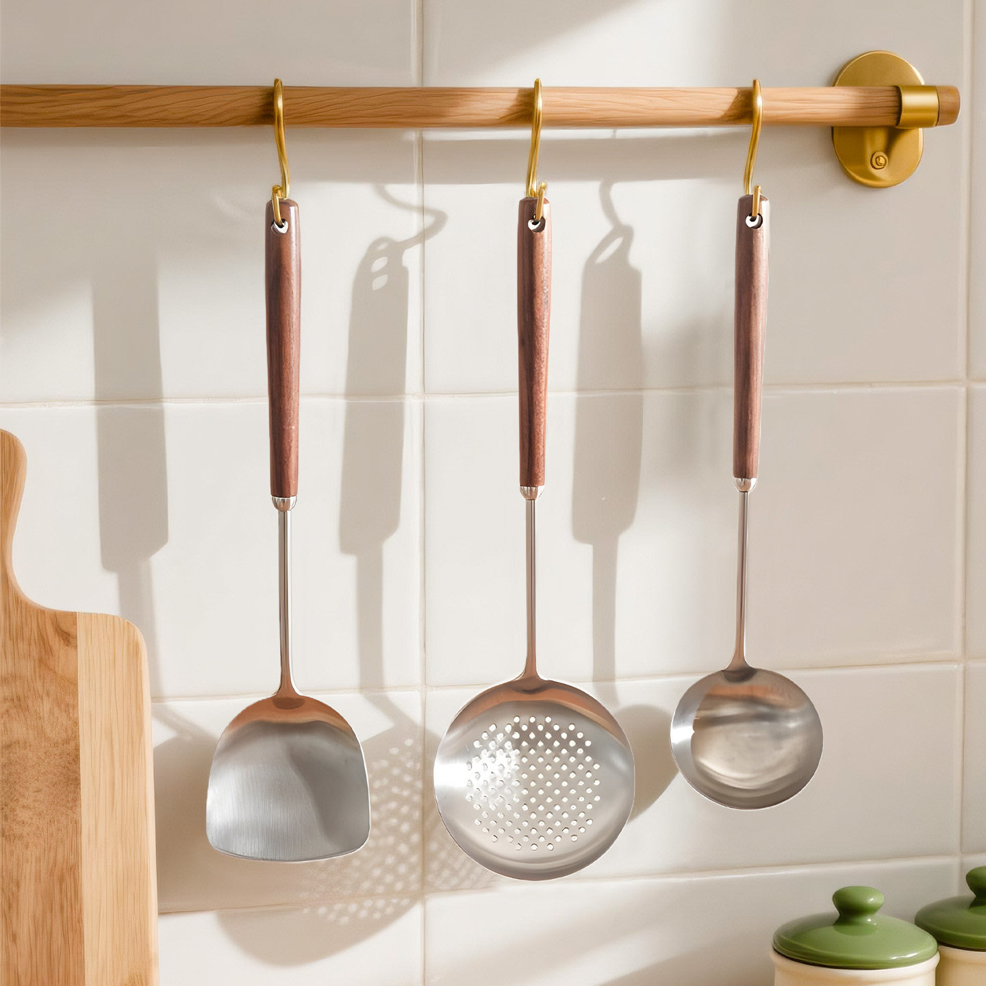 国风加长316不锈钢锅铲家用炒勺耐高温胡桃木柄炒铲汤勺漏勺套装