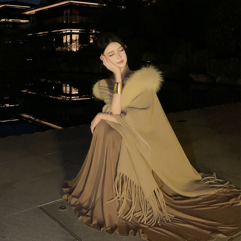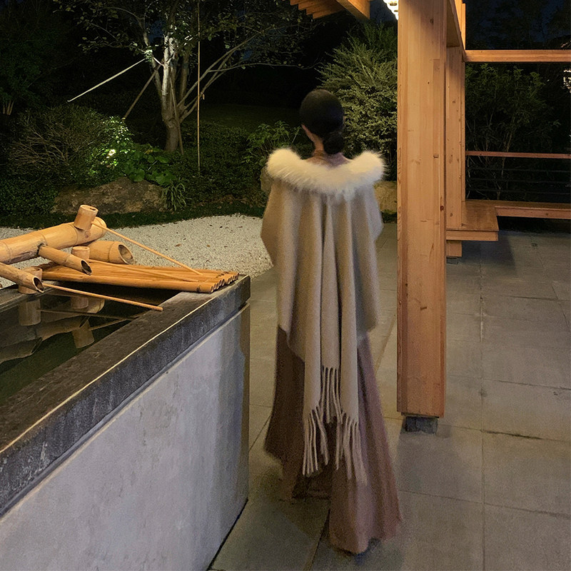 2025新款卡其色毛领披肩女秋冬季氛围感纯色保暖斗篷披风白色流苏