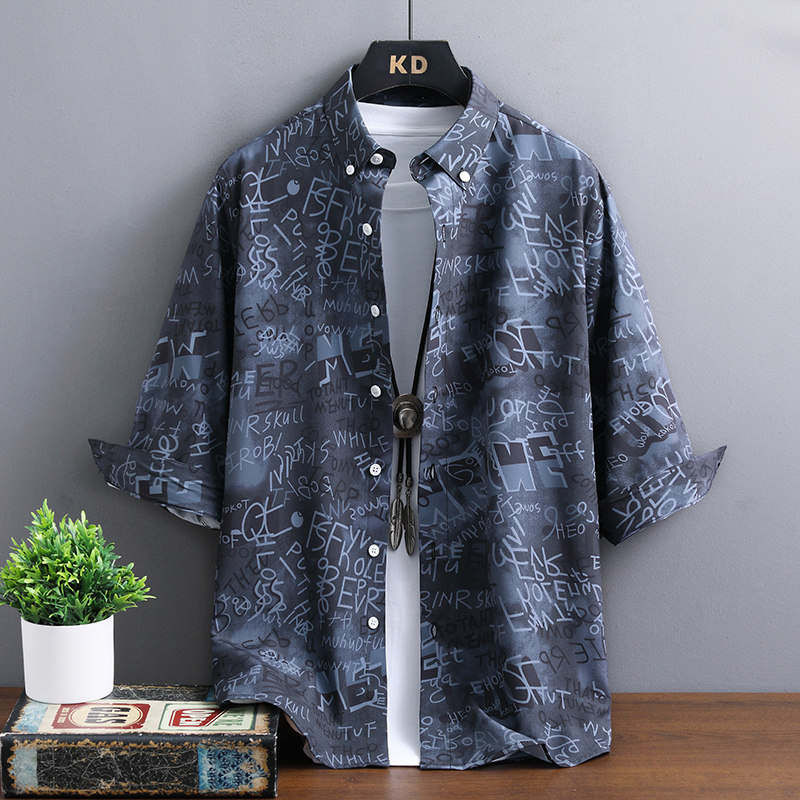男士夏装短袖衬衣冰丝潮牌涂鸦印花衬衫免烫高级感痞帅休闲寸衫薄
