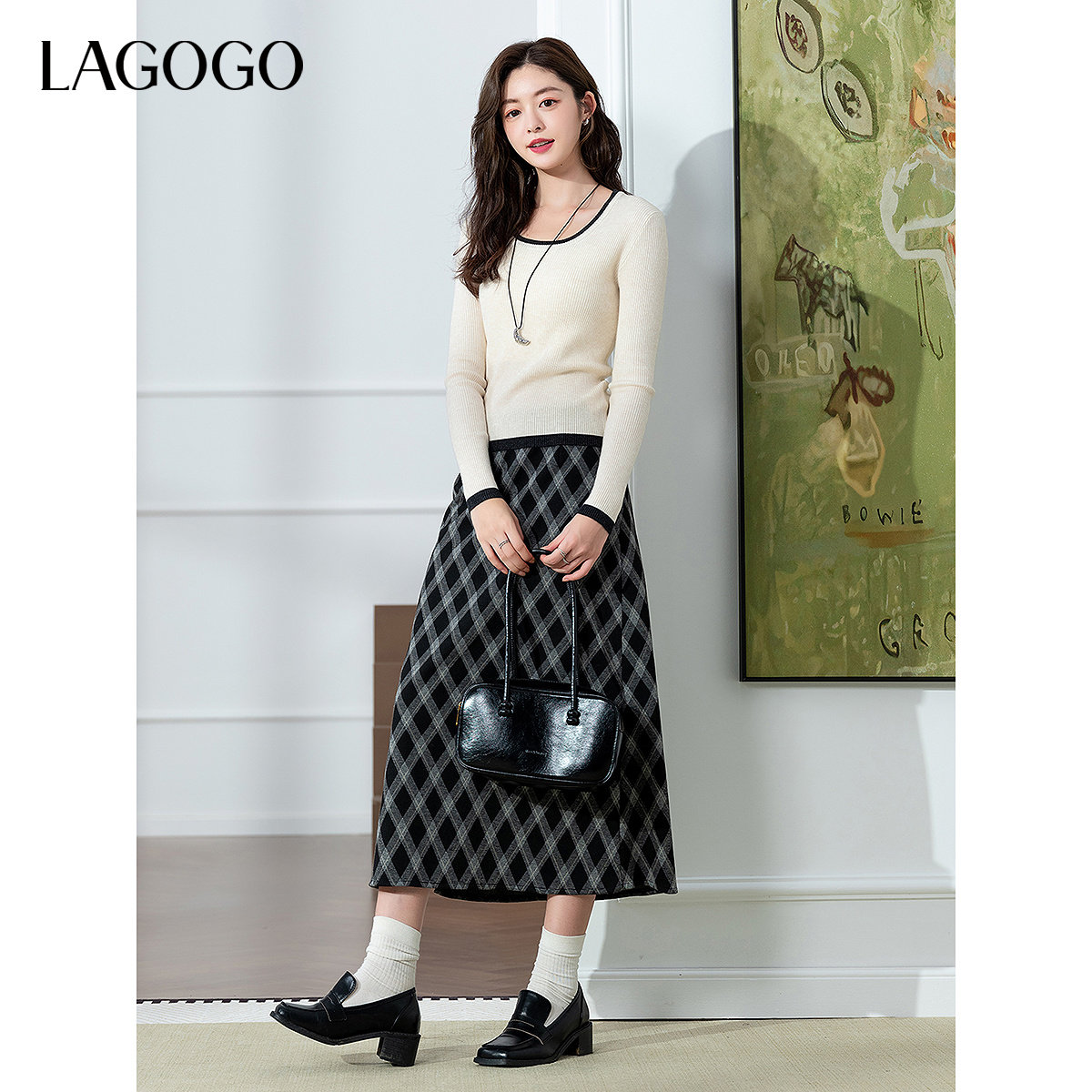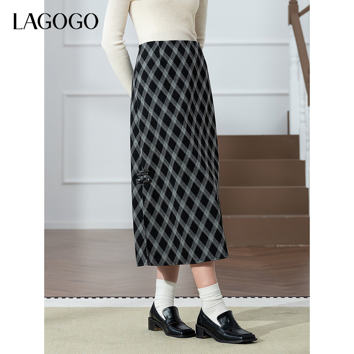 LAGOGO格纹高腰仿毛呢文艺半身裙女拉谷谷2026春新款开衩裙子