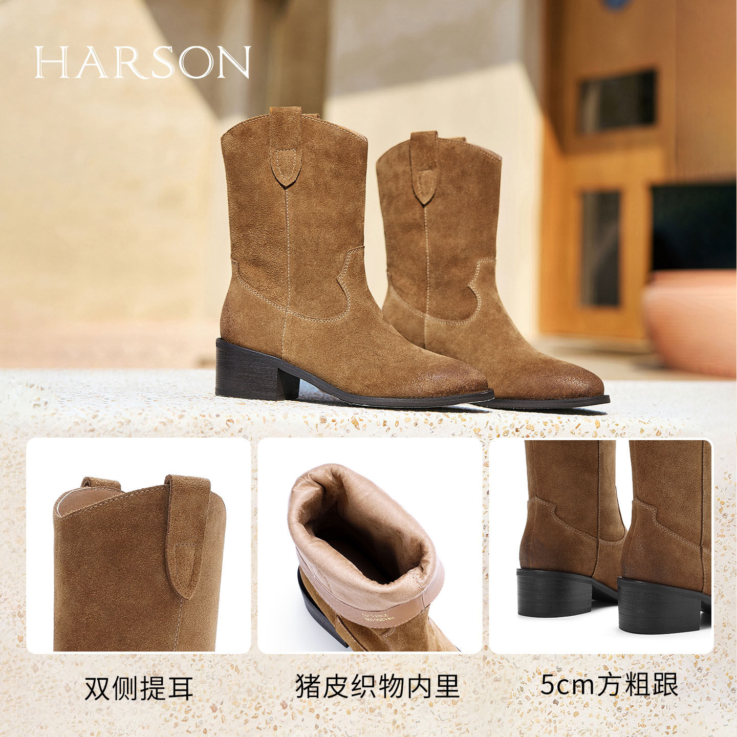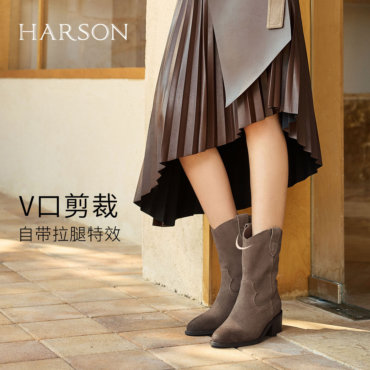 哈森/HARSON【西部诗行】25秋冬新款尖头高跟休闲牛仔靴中筒靴女