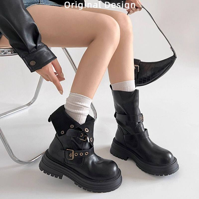 星期六英伦风马丁靴女复古2025冬新款厚底增高骑士靴皮带扣中筒靴