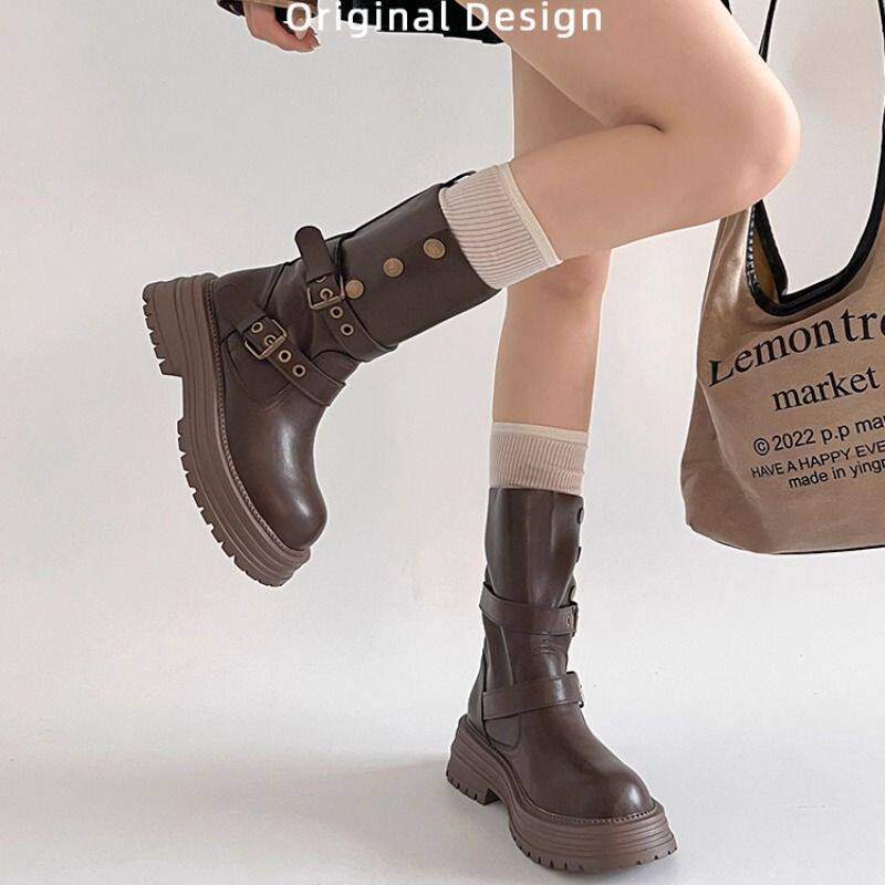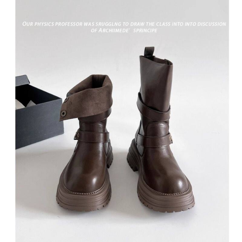 张元英同款皮带扣堆堆靴粗跟复古做旧中筒靴韩版靴子小众工装靴女